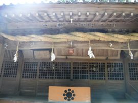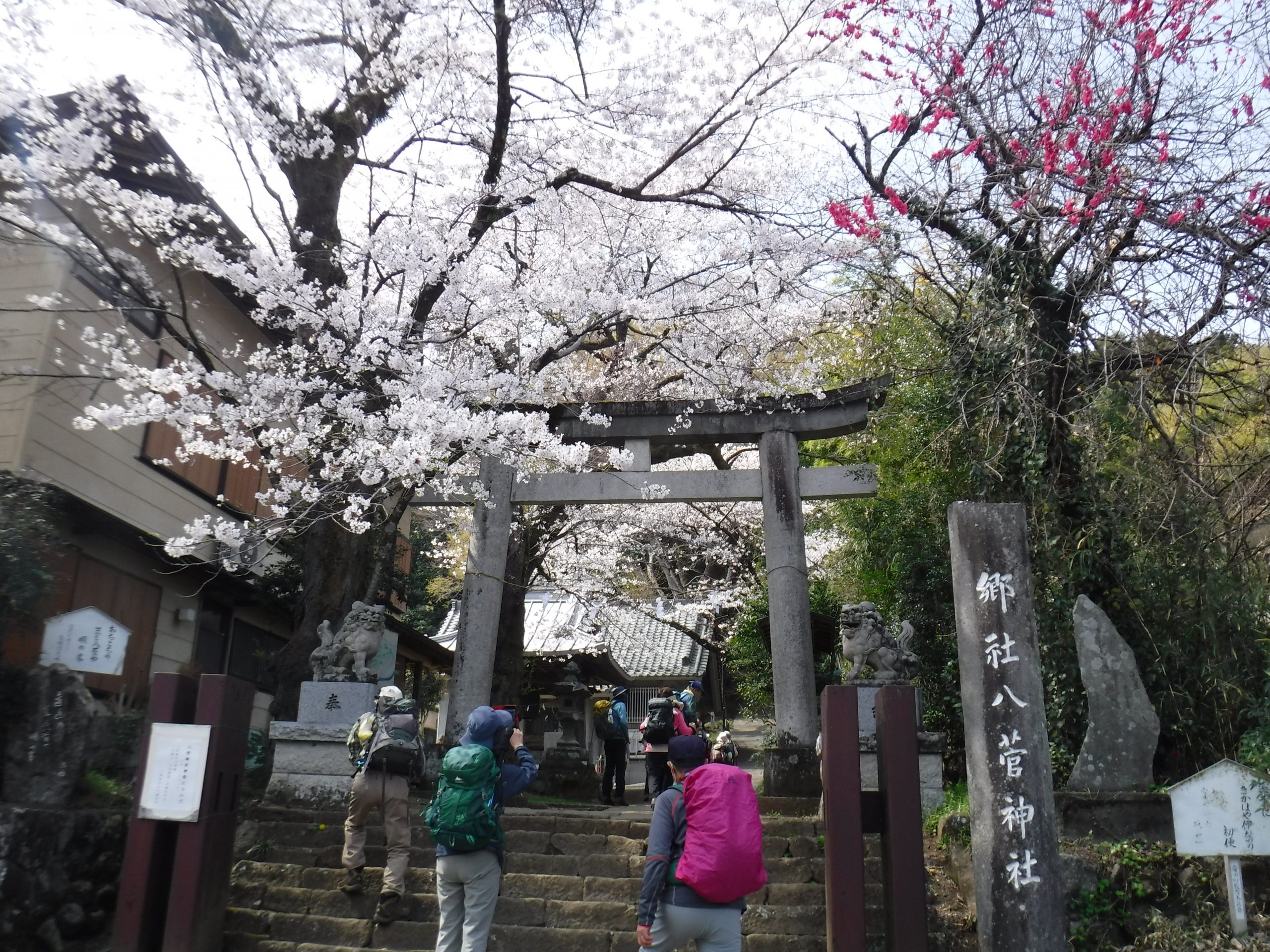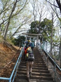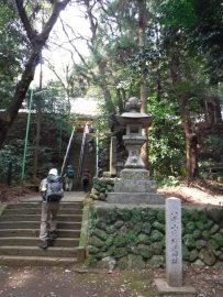 八菅神社の鳥居、その先に急な階段、加藤リーダーは、迷わず登り始める。