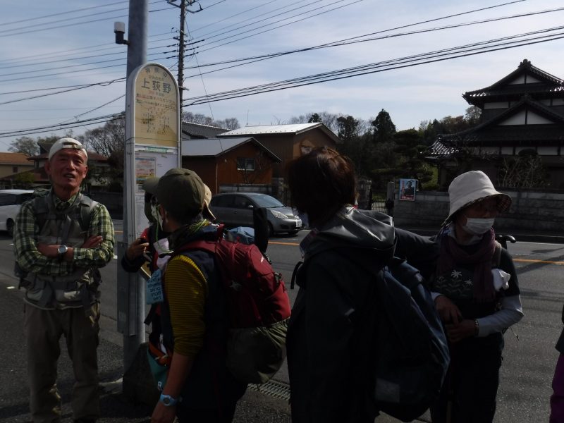 上荻野バス停、加藤リーダーの挨拶(夏のアルプスに向けて調整、頑張る)
