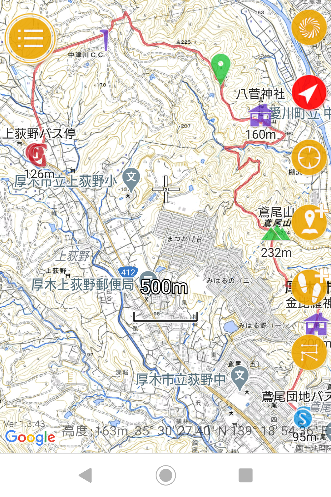 八菅山展望台13:40→上荻野バス停14:35→(バス)14:54→本厚木駅15:27