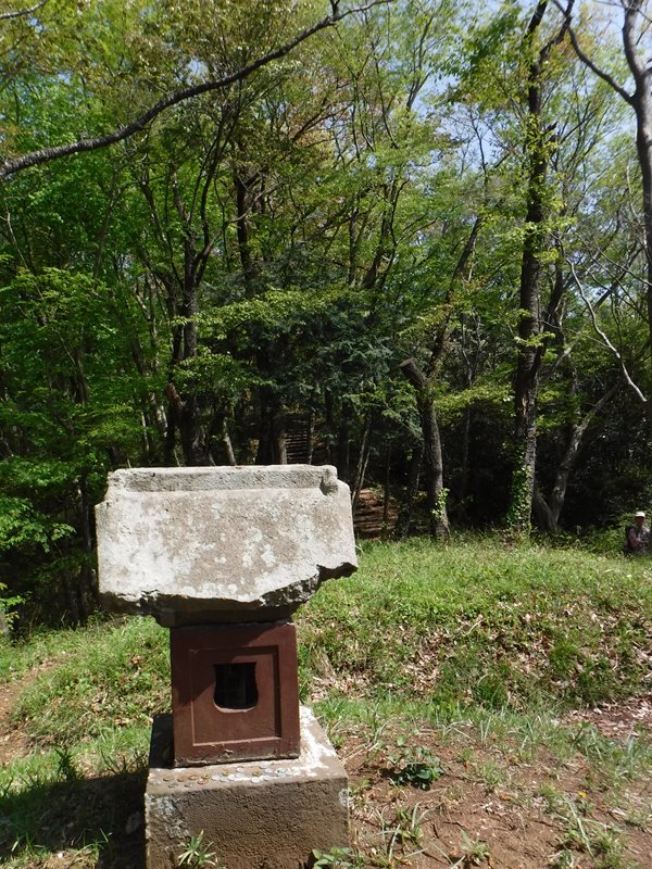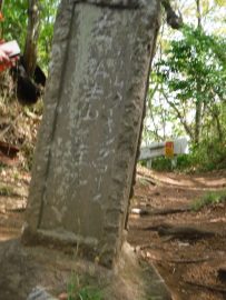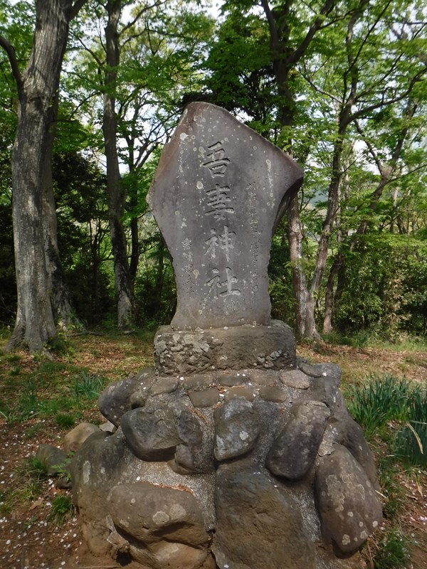 東屋と吾妻神社のある吾妻山の山道、古い石柱道標が真ん中にある