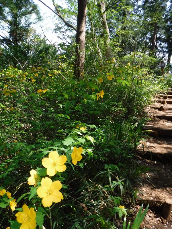 鉄塔、長い階段の尾根道、満開のヤマブキ、シャガ、ホタルカズラ等が励ましてくれました