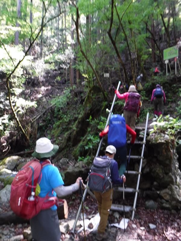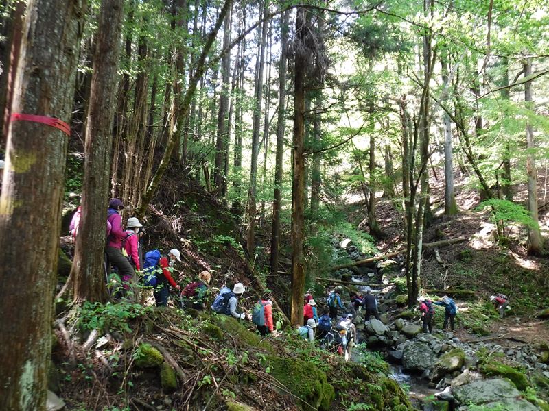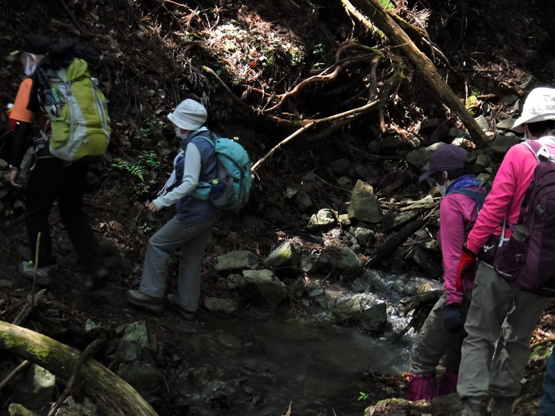 沢を横切る時は、助け合って慎重に渡る。何回も何回も渡った。もう少しで立野峠