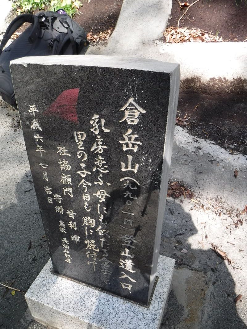 倉岳山登山口、石碑、変化に富んだ山歩きを期待!! 川の音を聞きながらルンルン