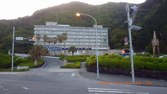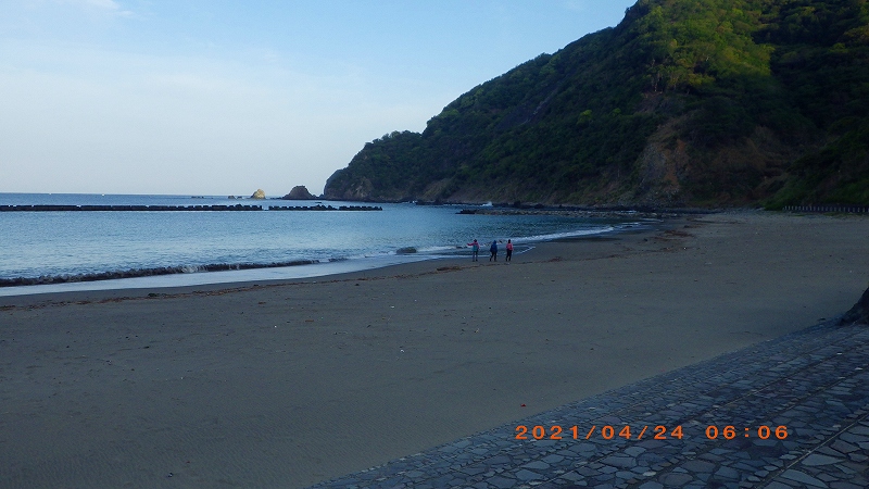 宿泊先 宇久須温泉西伊豆クリスタルビューホテル前の海岸(午前6時)