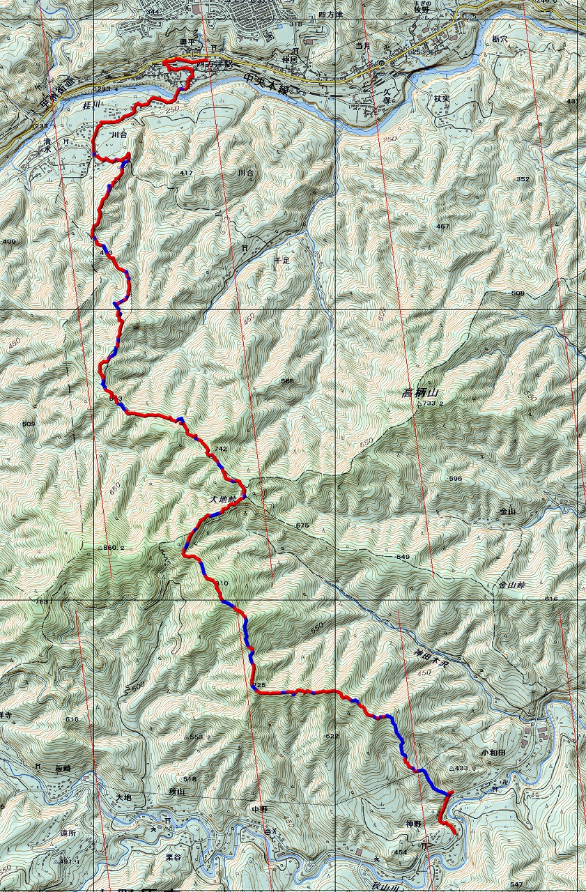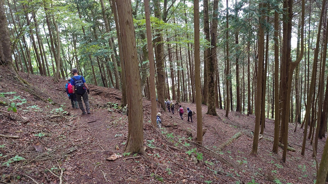 ▼コース:神野下村バス停下車9時→取付点9時10分→148番鉄塔9時50分→三本杉山11時30分~40分→甚ノ函山(昼食)12時10分~40分→旧大地峠12時50分→新大地峠13時5分→川合峠14時20分~30分→下山地→JR四方津駅14時50分=JR高尾駅15時2分発高尾行乗車。