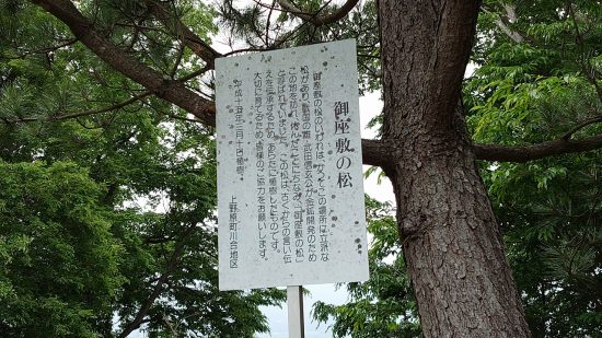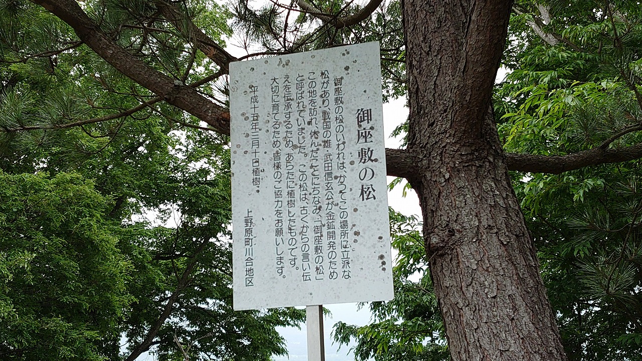 「御座敷の松」戦国の雄武田信玄公が金鉱開発で訪れ休んだことにちなみ、その言い伝えを伝承するために松を植樹した。「大切に育てるため皆様のご協力」をとある。