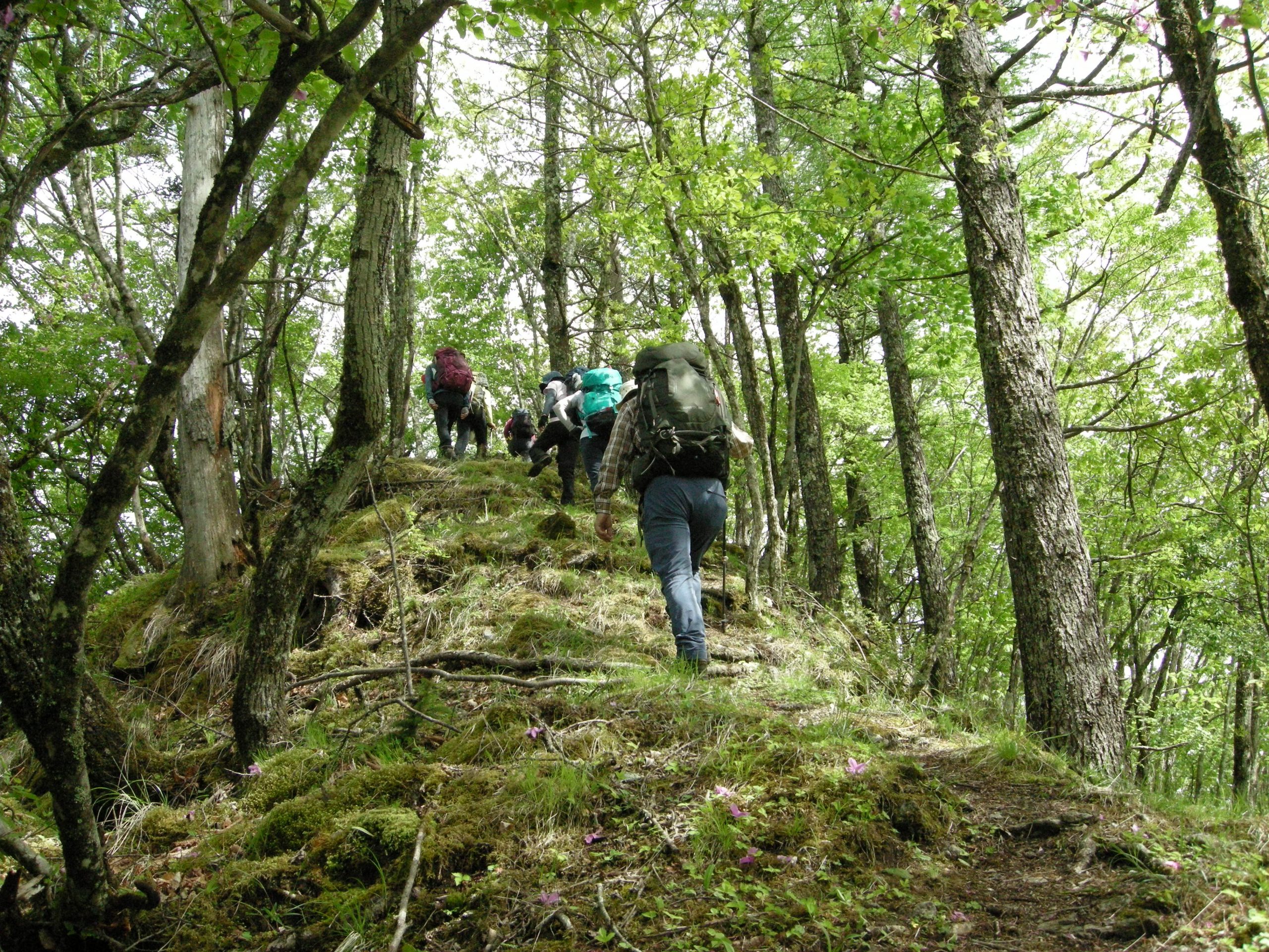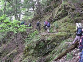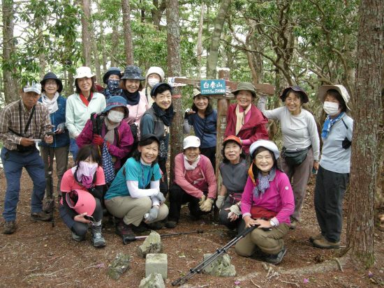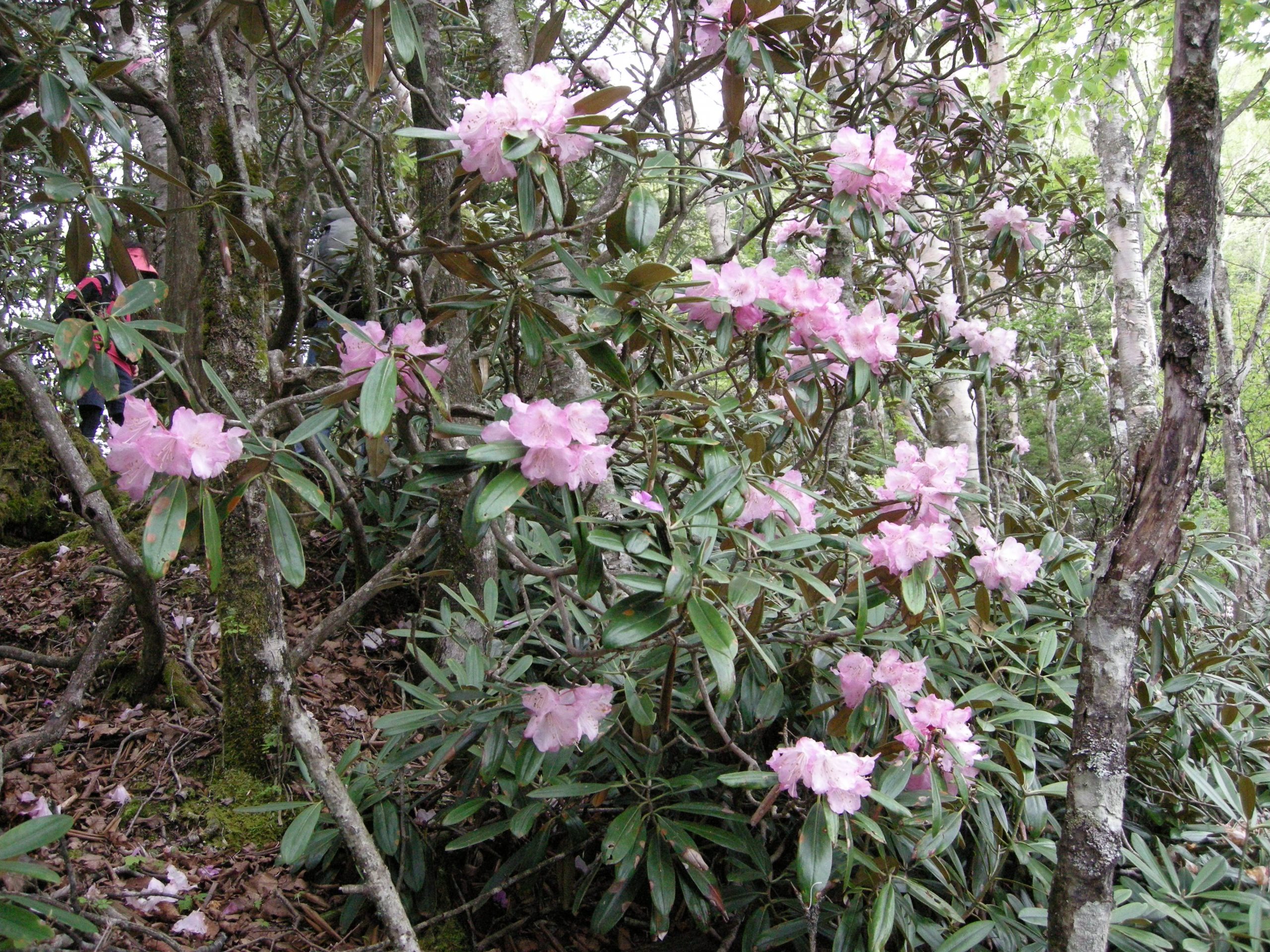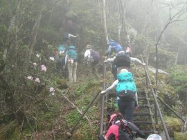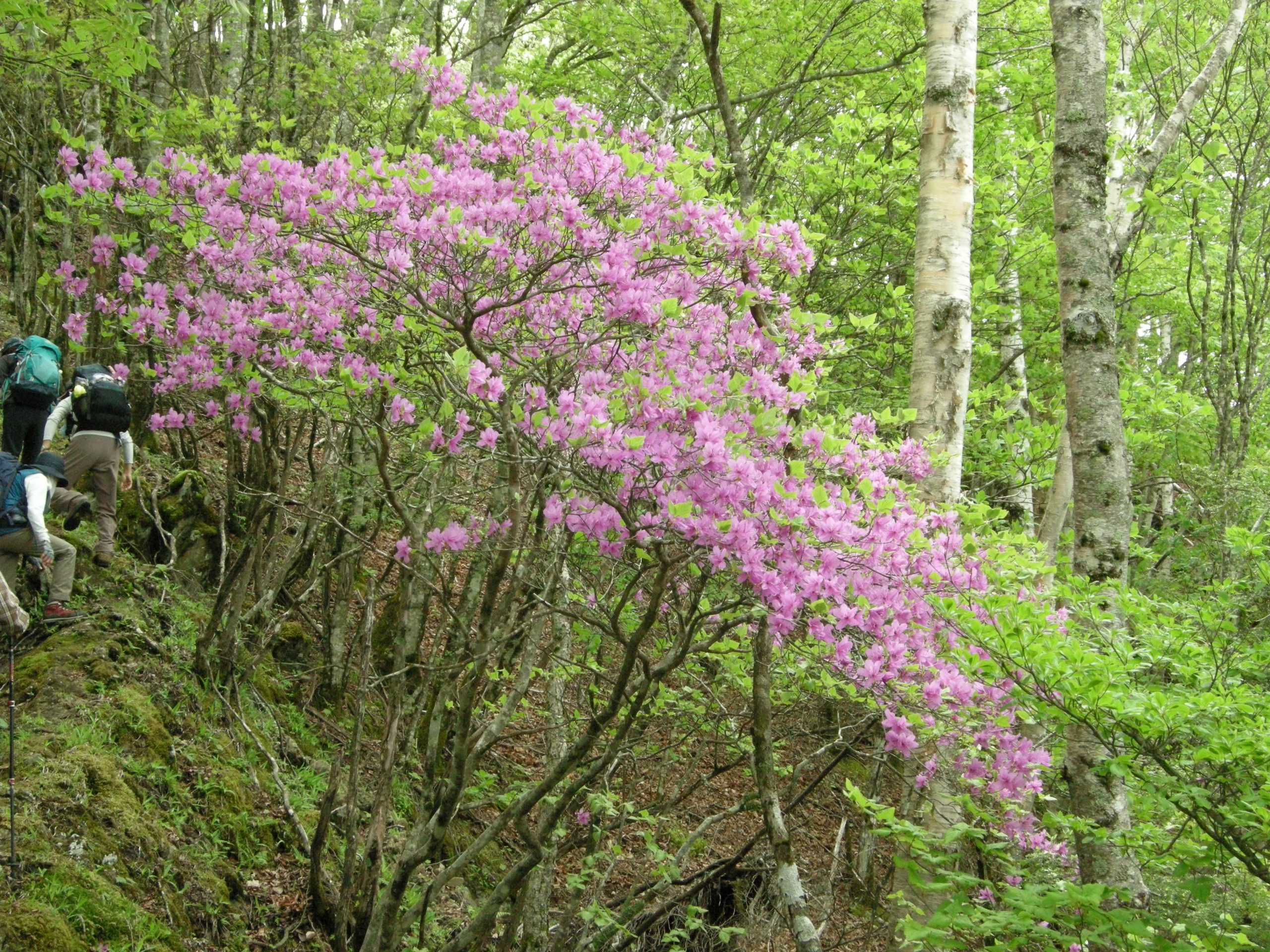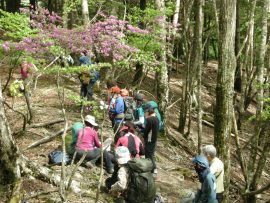 コメント:今回で5回目の計画でしたが、やっとお天気に恵まれ行って来ました。満開のミツバツツジと石楠花が迎えてくれました。計画通り全てのピークを踏んで来ました。素晴らしいお花に元気をもらって、急登、やせ尾根あり、嫌らしいトラバースと変化に富んだ長丁場を皆さん頑張りました。私の体調不良で1時間以上のロスタイムで下山が予定より遅くなり申し訳ありませんでした。お花、コース共に満足して頂けて5年間待った甲斐がありました。協力者、参加の皆様に感謝します。お疲れさまでした。