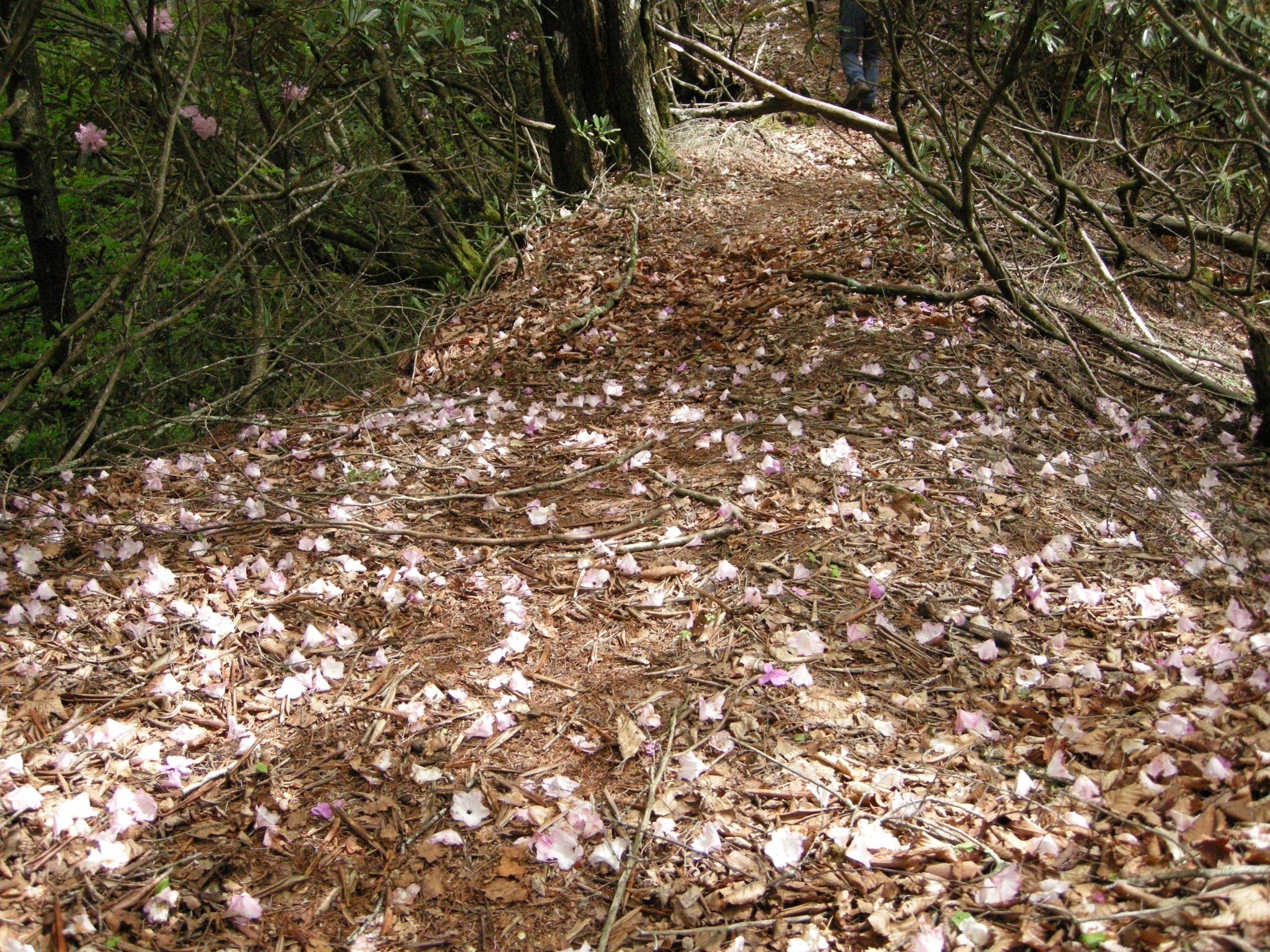 シャクナゲの群落を十分に楽しみ、花びらで登山道が覆われる中進む❕