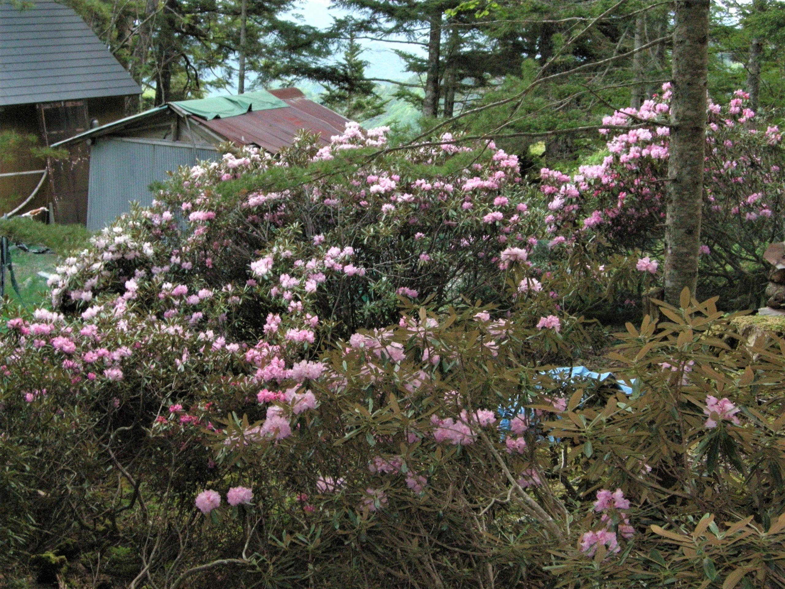 原生林コメツガに囲まれた十文字小屋 周りのシャクナゲが満開