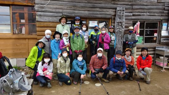 甲武信小屋前で集合写真、小屋主の撮っていただきました(2日目の朝)
