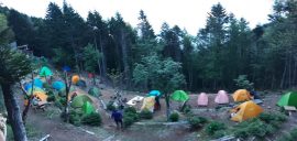 木賊山から見た甲武信ヶ岳 小屋の前は、たくさんのテントです