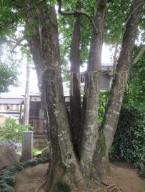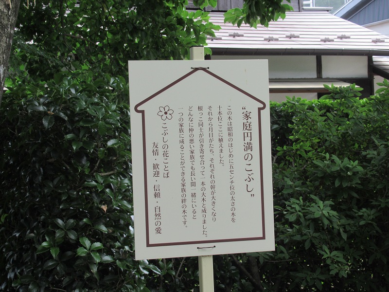 境内にある「家庭円満のこぶし」 昭和のはじめに10本ぐらいのこぶしの木を植えたところ年月がたち、根っこが引き寄せ合って1本の大木となり、家族絆の木ですと案内板に書かれています。