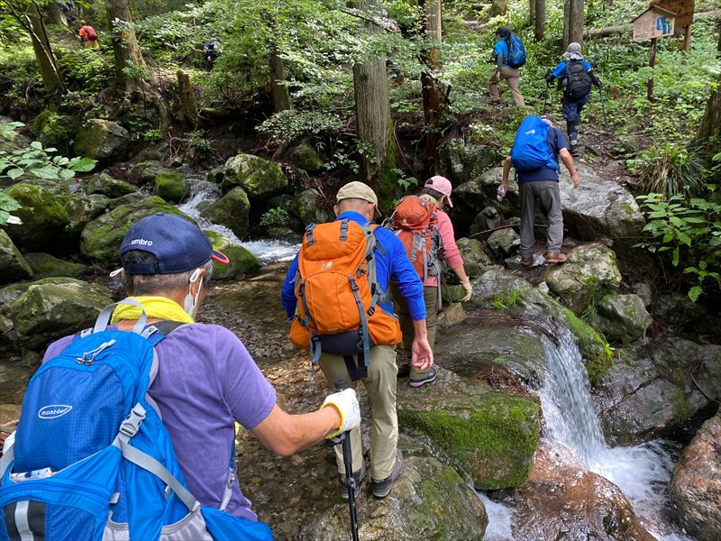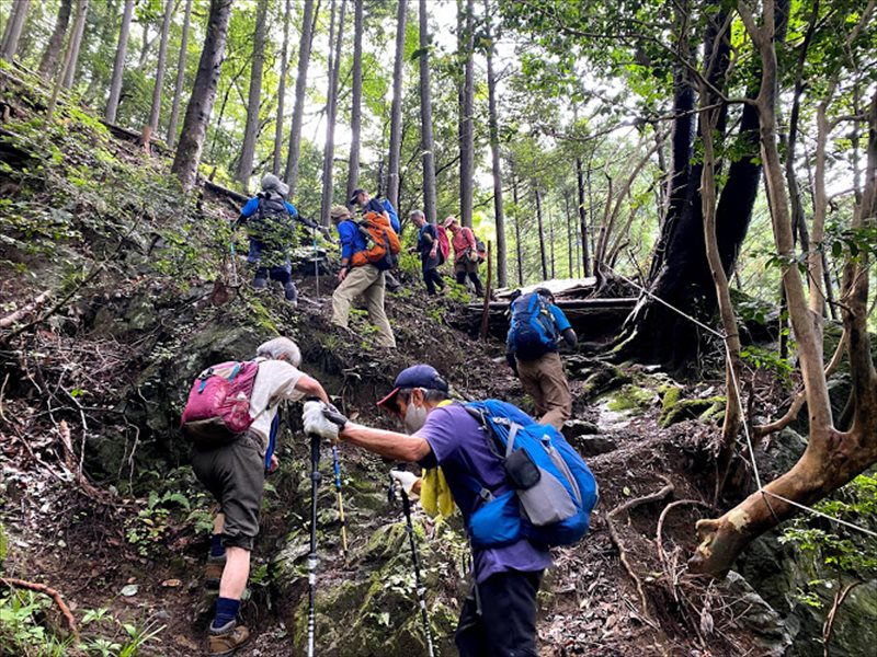 その後のきつい登りの後、つづら岩のある尾根に到達し、この尾根の最高峰である馬頭刈山を経て、瀬音の湯、十里木まで歩くというロングコースになりましたが、皆さん、水分、塩分をしっかり摂り、無事に下山することができました。