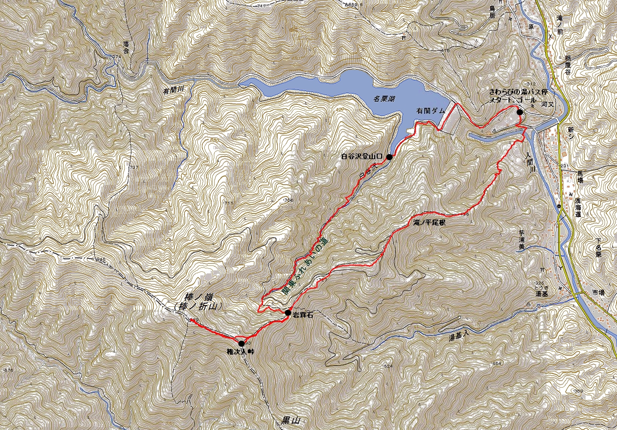 | 「ルート&タイム」 さわらびの湯バス停スタート 9:28 → 白谷沢登山口 9:53 → 白孔雀の滝 10:59 → 岩茸石 11:45 → 権次入峠 12:16 → 棒ノ嶺 12:31 → 権次入峠 13:27 → 岩茸石 13:51 → 滝ノ平尾根 → さわらびの湯バス停ゴール 16:04。 距離:8.45km 、所要時間:6時間36分。(GPSデータ参照) |