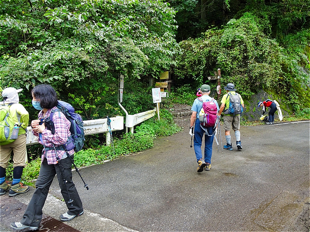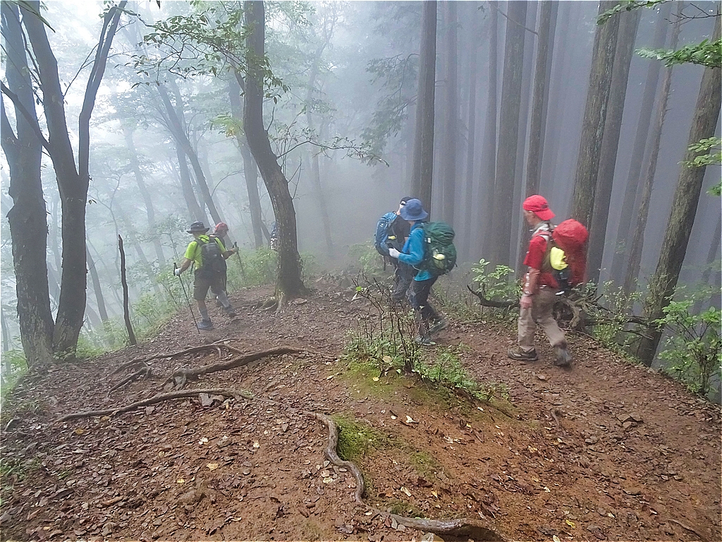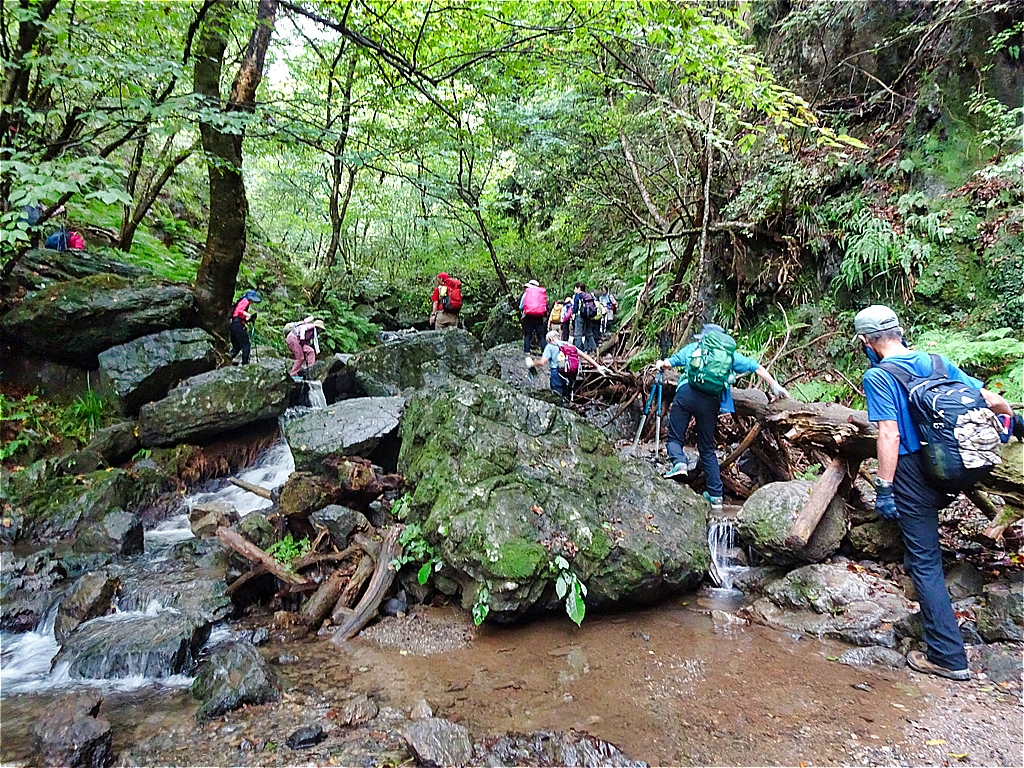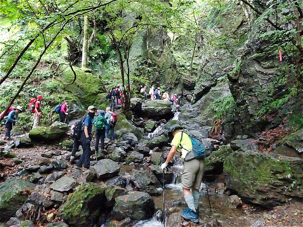 ~~~~~~~~~~~~~~~~~~~~~~~~~~リーダーコメント 緊急事態宣言解除により、2か月ぶりの山行を実施です。 沢沿いの登りは、前日の雨天で沢の水量が増し、又、濡れた岩場は滑り易く、苦戦しましたが、皆、スリル満点で楽しかった様です。 山中は、老若男女問わず、多くの登山者で賑わって居ました。 皆さん、無事に下山でき、お疲れさまでした。 |