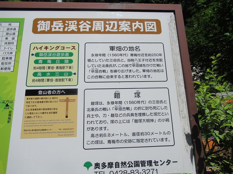 永禄年間(1560年代)青梅付近を約250年領としていた三田氏と、当時八王子付近を支配していた北条氏がこの地で辛垣城をかけた戦い「辛垣合戦」を繰り広げました。軍畑の地名はこの合戦に由来すると言われています。(案内板より)