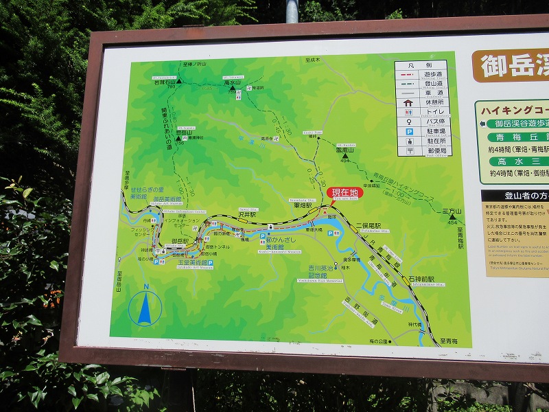 コース:JR青梅線軍畑駅10時40分集合 歩行開始10:45→遊歩道入口10:55→楓橋→寒山寺11:45→御岳園地12:20(昼食)13:00→神路橋13:20→フィッシングセンター13:40→御岳園地14:20(解散)→御嶽駅