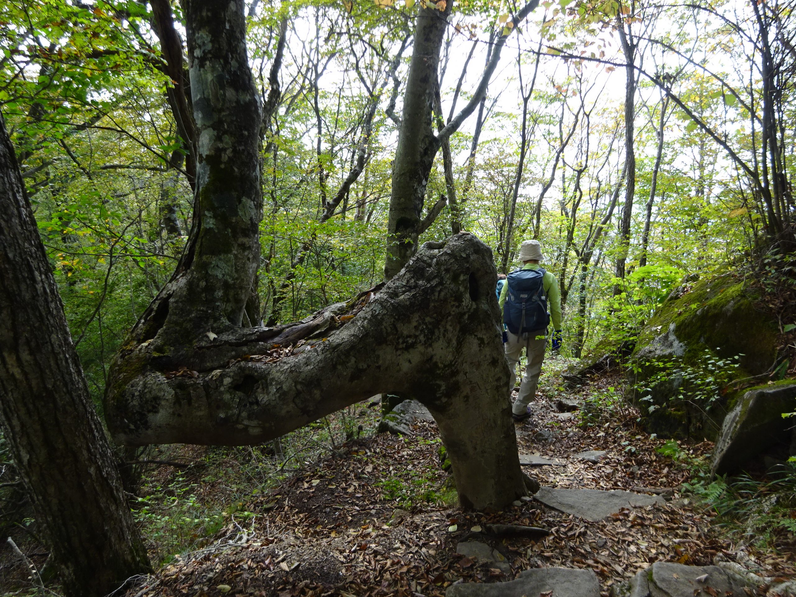 槇寄山へ向かいます、不思議な形の木の横を通り、長い階段を下ります