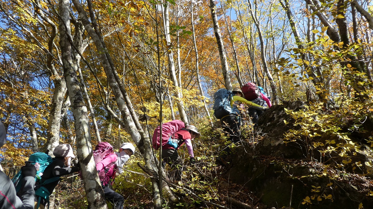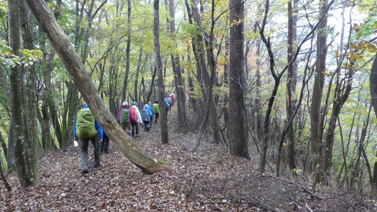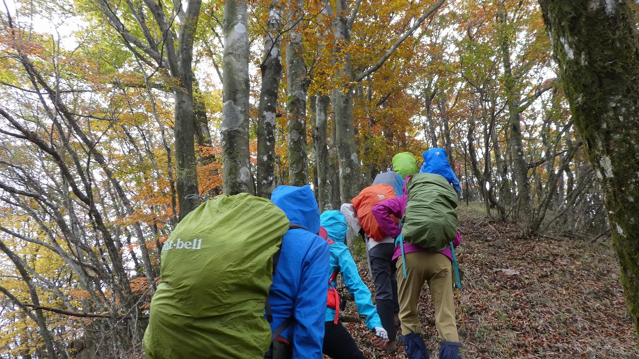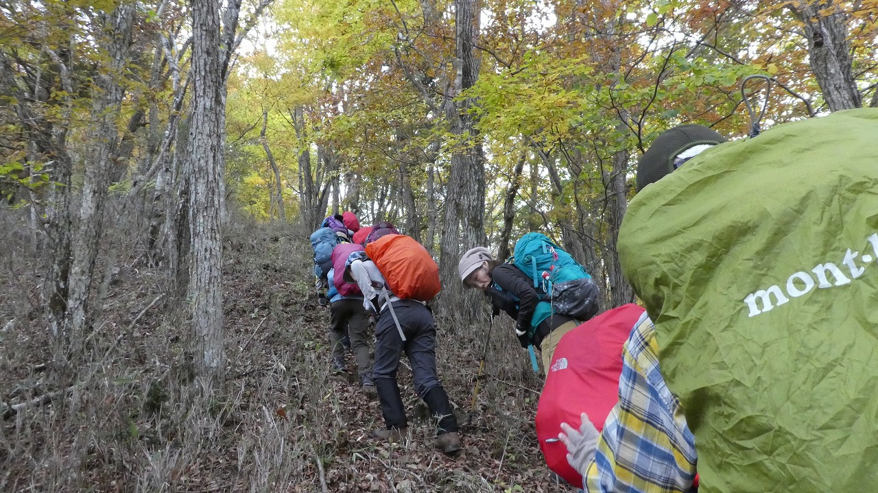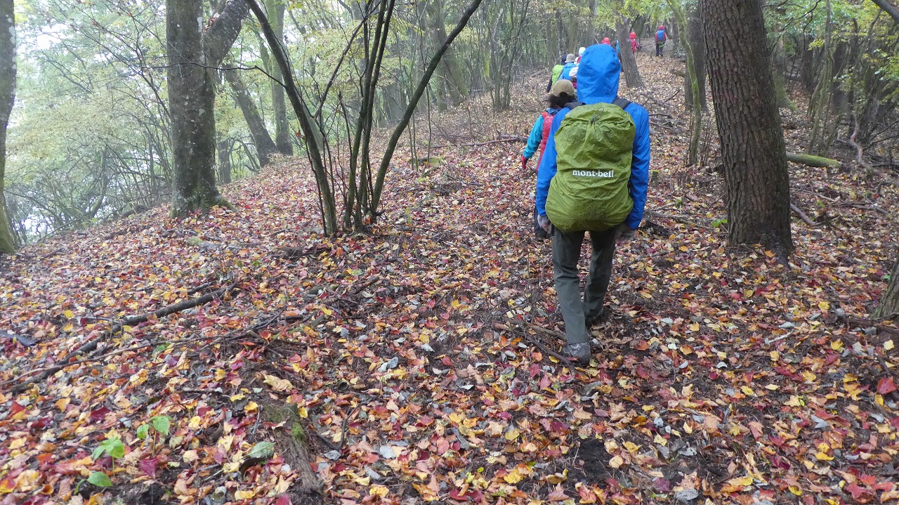 山川リーダー、スタッフの皆様、大変お世話になりました。 道志山稜の山々は、年々バス便が削減され、マイカー山行でなければ行けない山が増えてきています。今回は個人では敬遠しがちなバス便なしの山稜を案内していただきました。初日は取り付き点からいきなりの急登、枯れ沢のゴロゴロ斜面、手を使っての岩場、、、楽しませていただきました。そして大パノラマんの絶景のご褒美!!2日目も秋山峠まで一気に登り上げ、あとは静かな稜線歩き。雨は降りはじめましたが、紅葉した木々に霧がまといつき幻想とした山稜を歩けました。巌道峠に降りるとタクシーが待っていて、上野原駅に降りると8分後に東京行きの快速が到着。なんとナイスな時間配分にびっくりです。楽しい山行をありがとうございました。