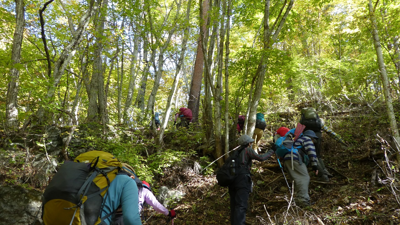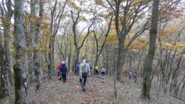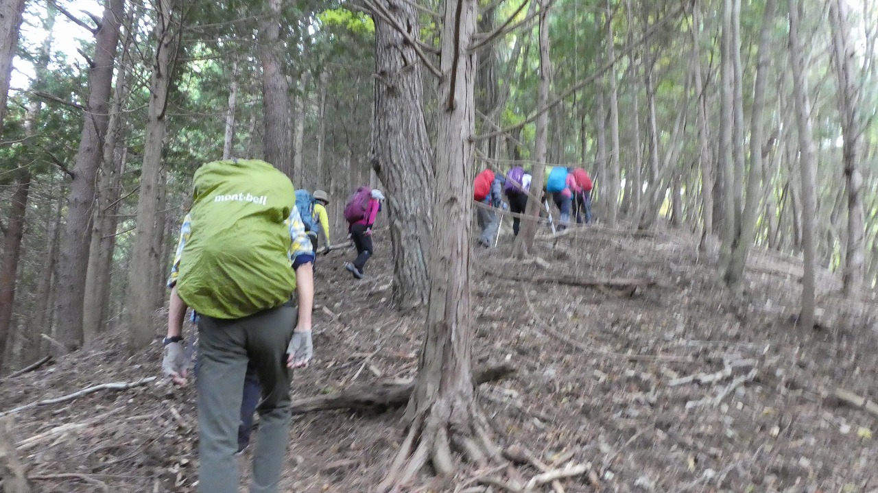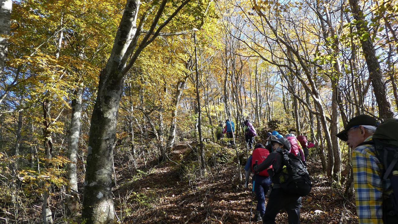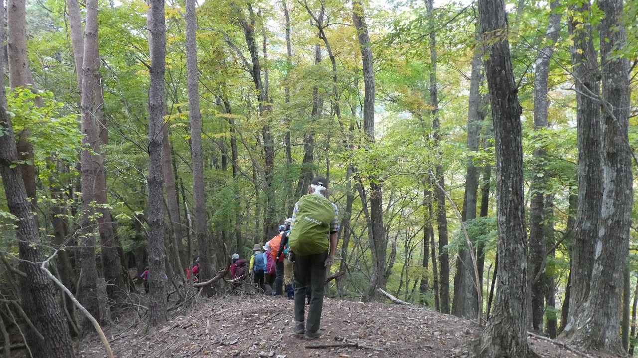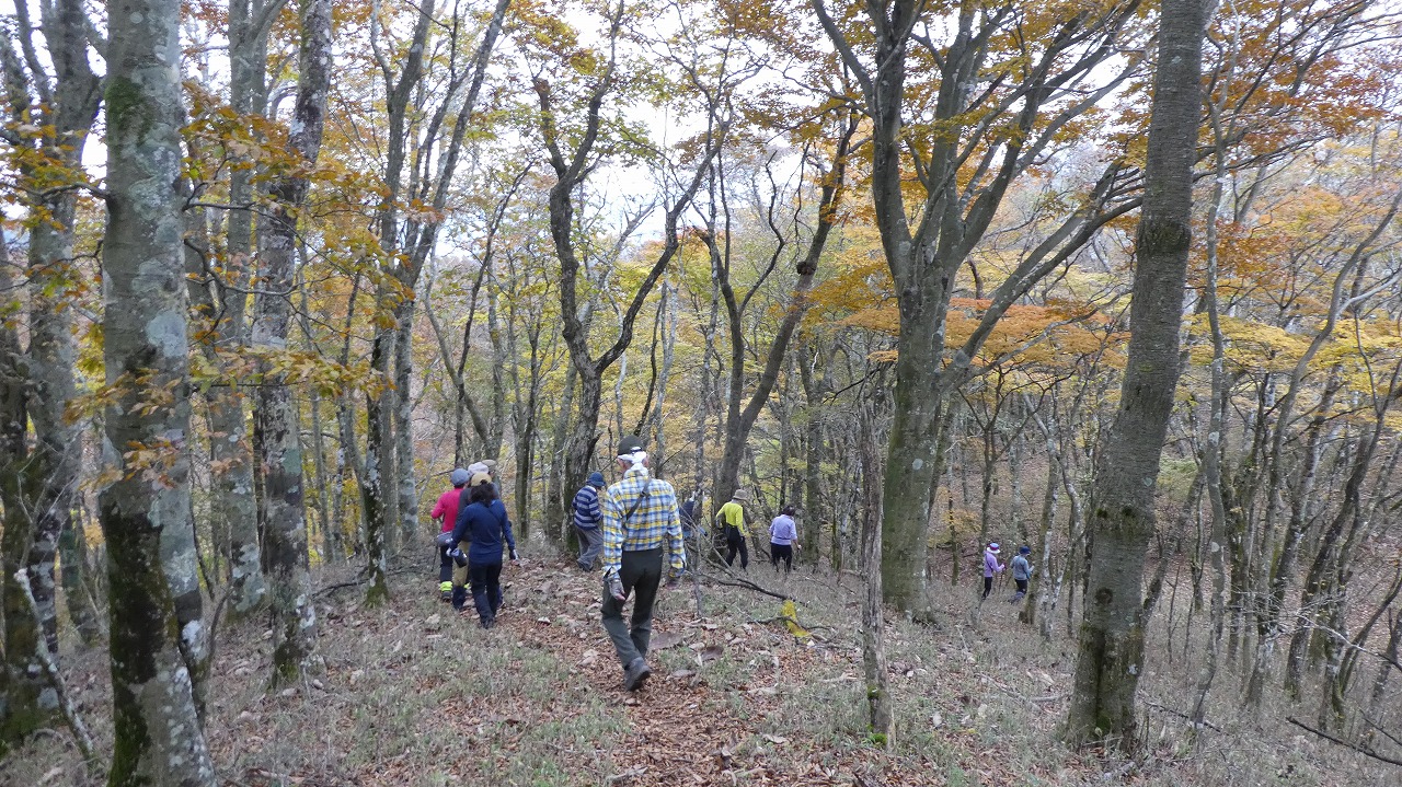 山川リーダー、スタッフの皆様、大変お世話になりました。 道志山稜の山々は、年々バス便が削減され、マイカー山行でなければ行けない山が増えてきています。今回は個人では敬遠しがちなバス便なしの山稜を案内していただきました。初日は取り付き点からいきなりの急登、枯れ沢のゴロゴロ斜面、手を使っての岩場、、、楽しませていただきました。そして大パノラマんの絶景のご褒美!!2日目も秋山峠まで一気に登り上げ、あとは静かな稜線歩き。雨は降りはじめましたが、紅葉した木々に霧がまといつき幻想とした山稜を歩けました。巌道峠に降りるとタクシーが待っていて、上野原駅に降りると8分後に東京行きの快速が到着。なんとナイスな時間配分にびっくりです。楽しい山行をありがとうございました。