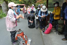 降り始めの沢を跨いだ辺りからトラバース道が悪いのでレベル4にしましたが除けば一般向のコースです。予定より1本早いバスに乗車出来ました。皆様の健脚に乾杯‼ 佐野満喜子