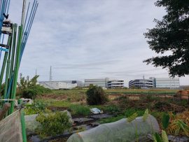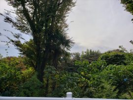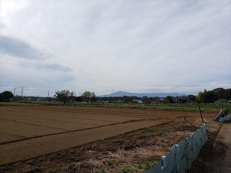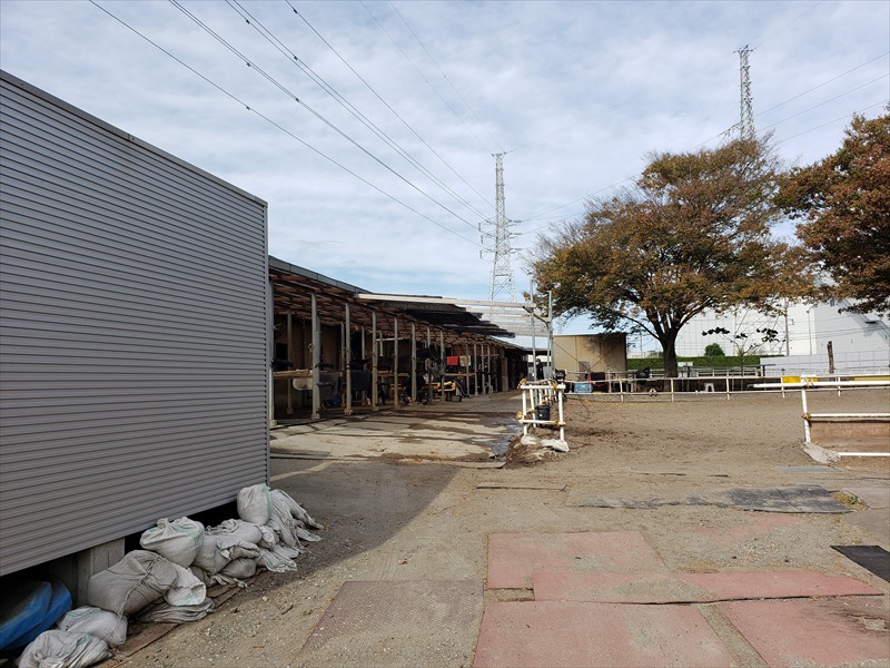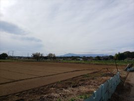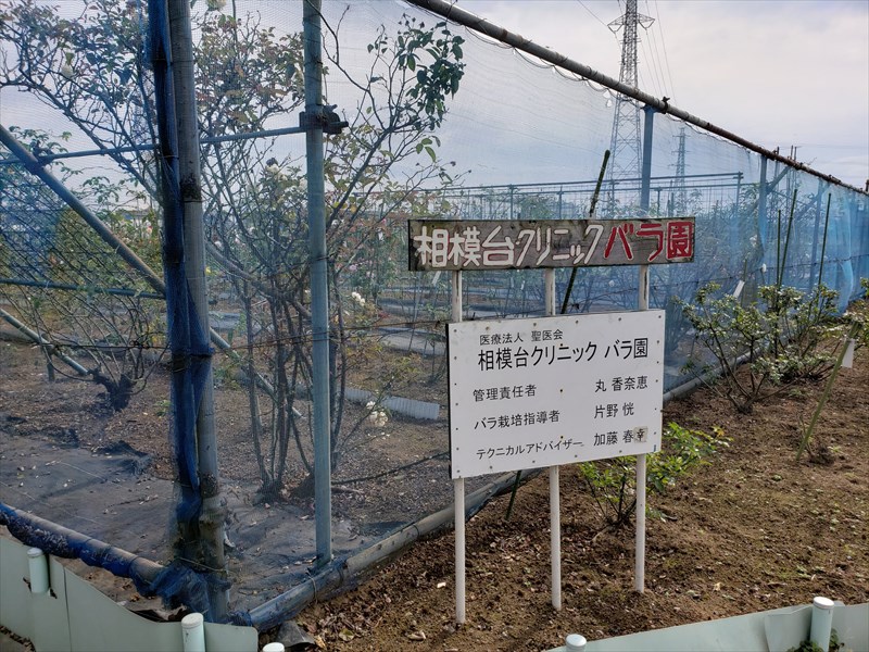 厩舎前にバラ園 台地建物無い畑地の先に大山