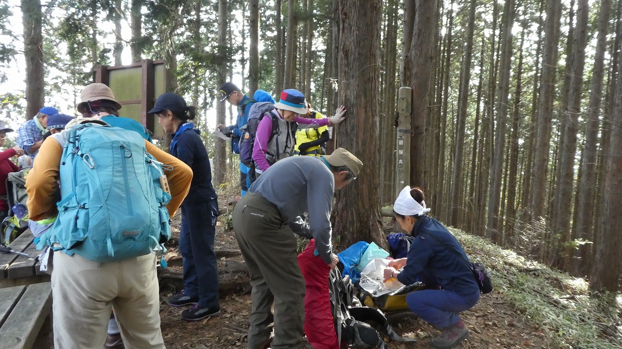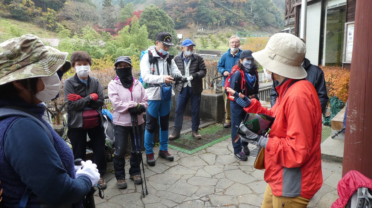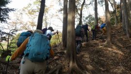山川リーダー、スタッフの皆様、お疲れ様でした。醍醐峠への枯れ沢の登行、醍醐丸から市道山への落ち葉を敷き詰めた尾根歩き。臼杵山へは岩ゴロの急登、急下降、バリ直登のよじ登りなど飽きないコース展開でした。ロングコースでしたが、葉の落ちた木々から木漏れ日が射して、綺麗な景観の中を歩けました。なんといっても下山口の元郷に降りると、1分後に市営バスが到着!! 19名のパーティーを抜群のペース配分で引っ張ってくれて、いつもながら感謝です。ありがとうございました。