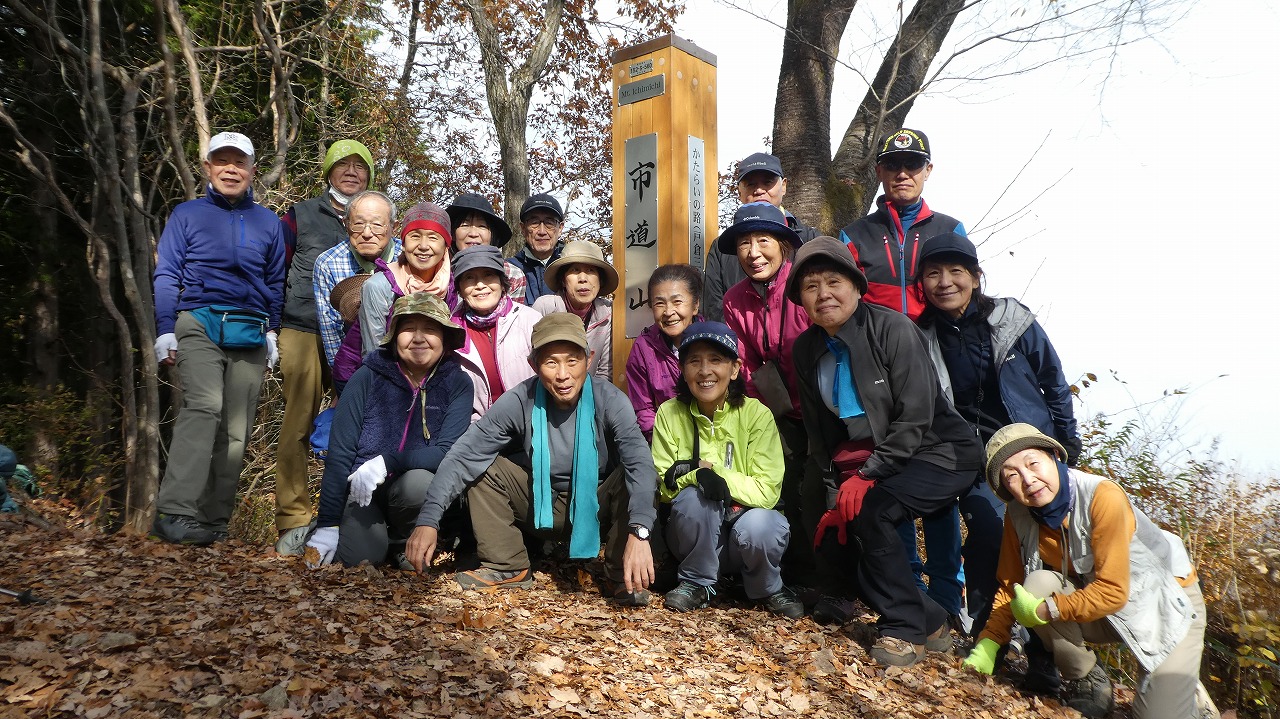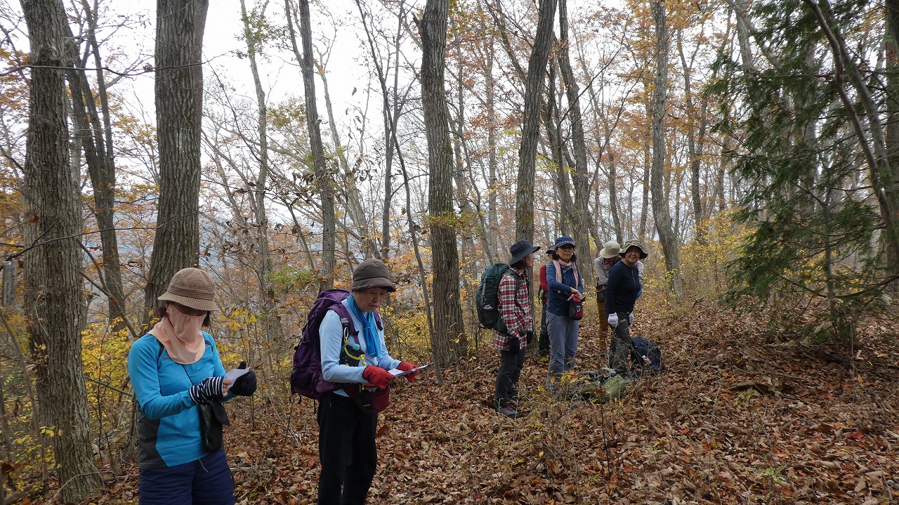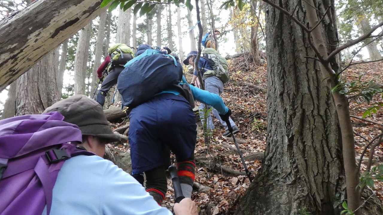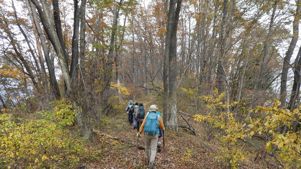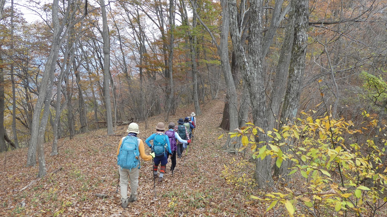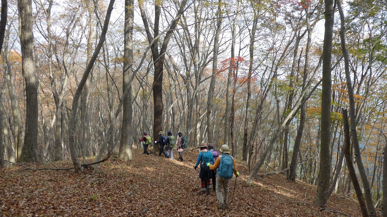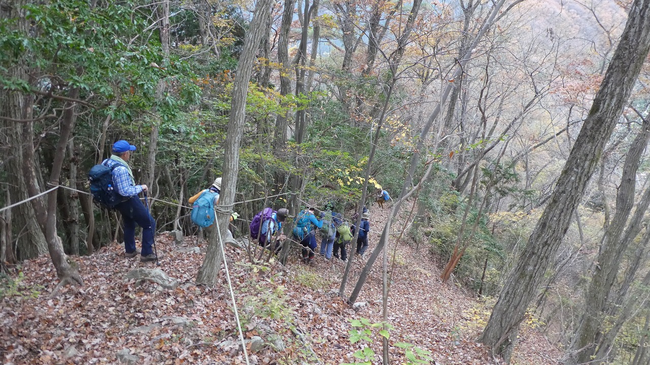 「雑木の紅葉を楽しみながらのんびり歩いていたのが、市道山からは露岩状の登下降の連続で気が抜けない。戸倉三山の会山行で歩いたのは3年前なのに、その時の記憶はどこに消えたのやら、脚の訓練にはよいコースだったが、下山のバスに合わせて参加者に忙しい思いをさせたのを反省する。