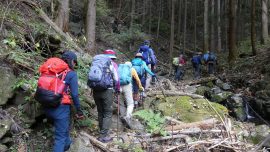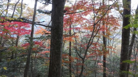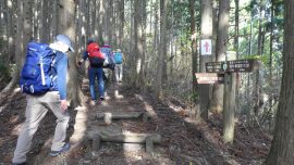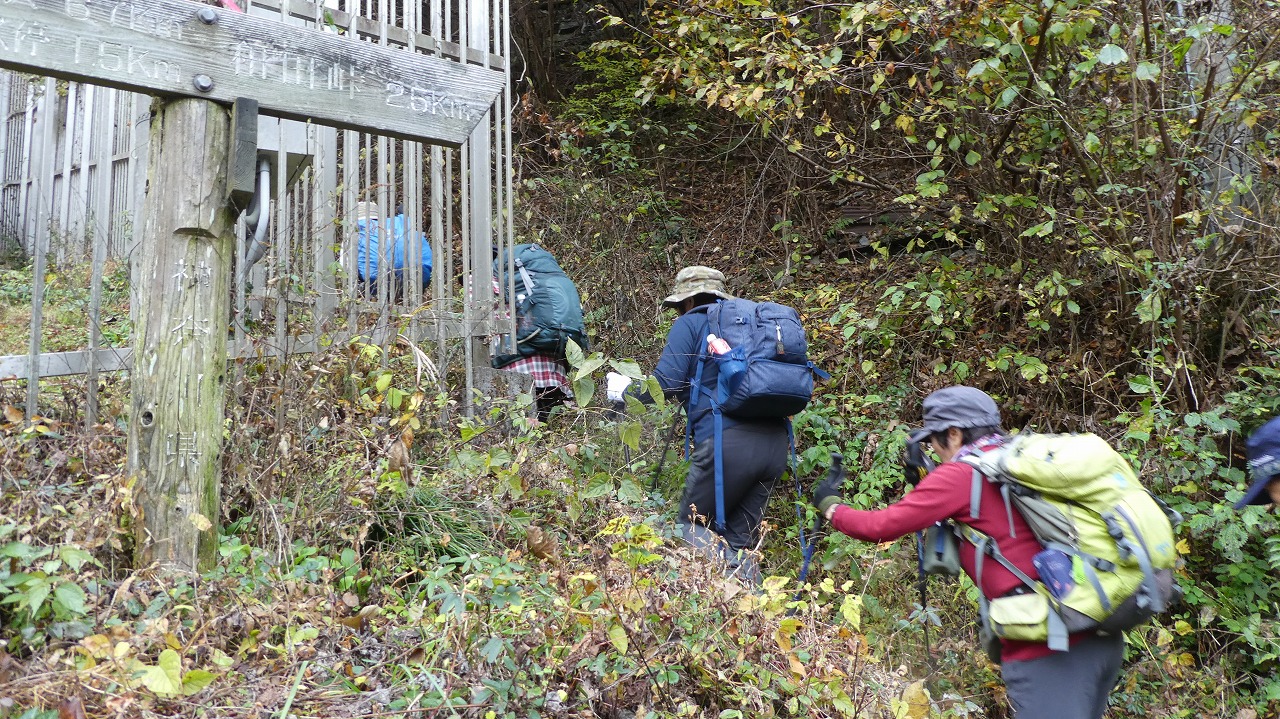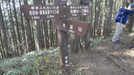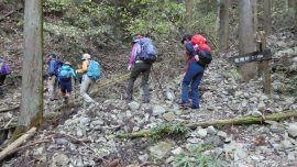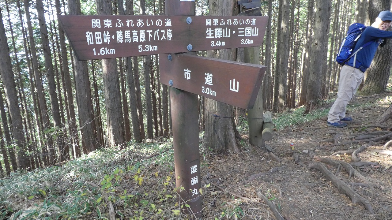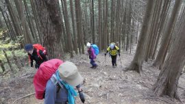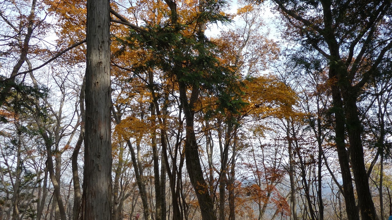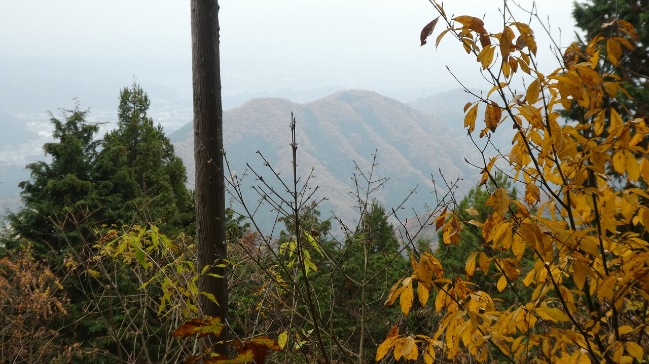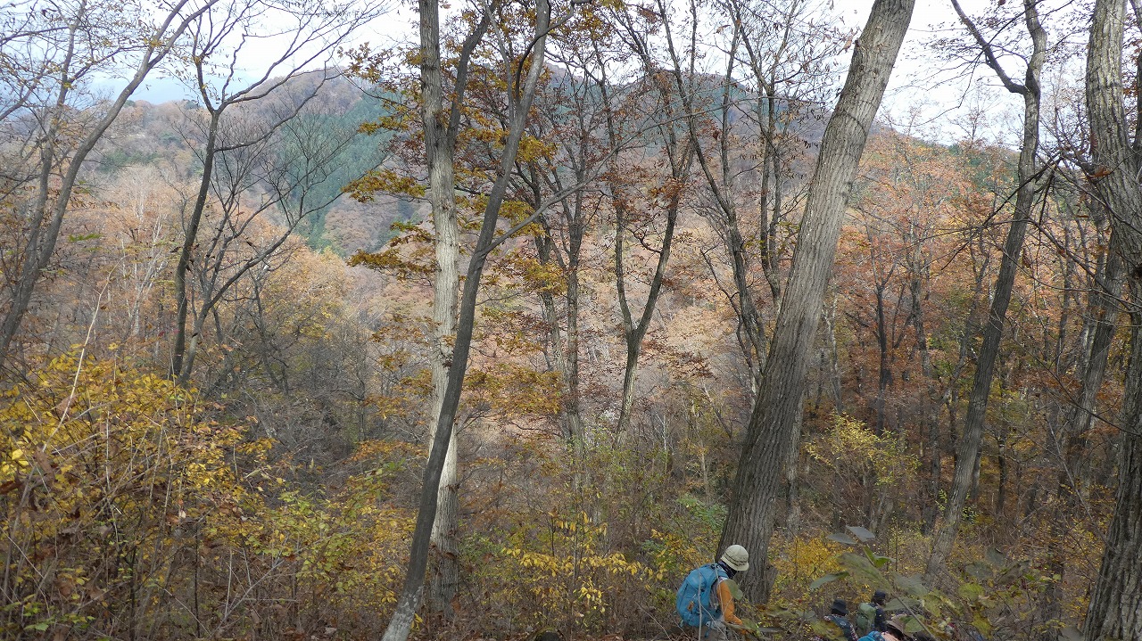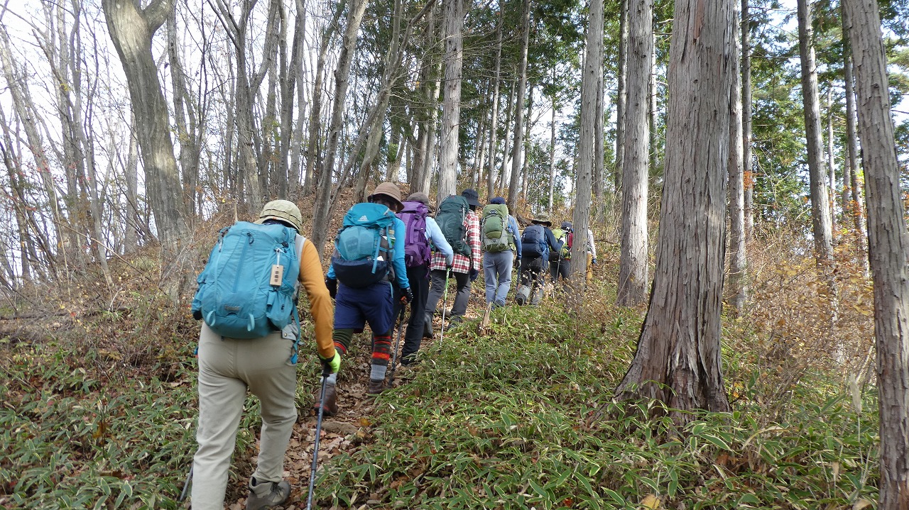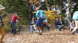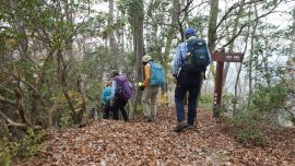 「雑木の紅葉を楽しみながらのんびり歩いていたのが、市道山からは露岩状の登下降の連続で気が抜けない。戸倉三山の会山行で歩いたのは3年前なのに、その時の記憶はどこに消えたのやら、脚の訓練にはよいコースだったが、下山のバスに合わせて参加者に忙しい思いをさせたのを反省する。