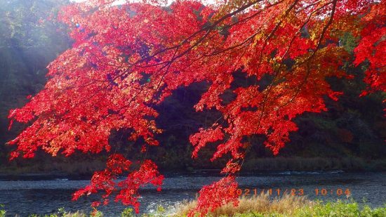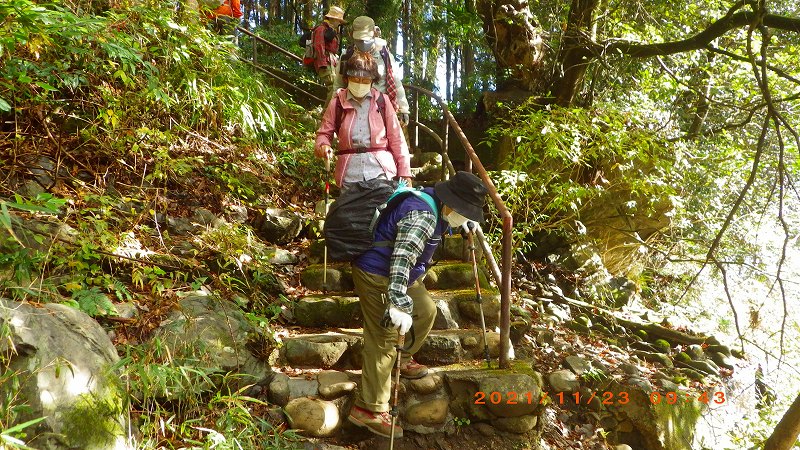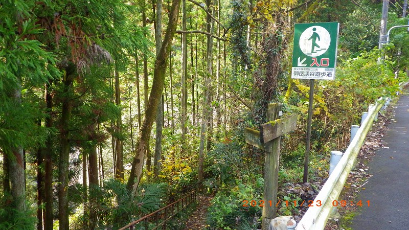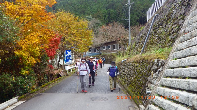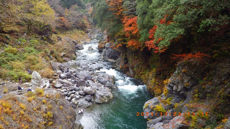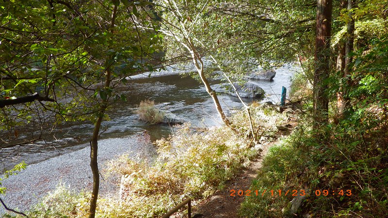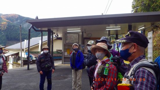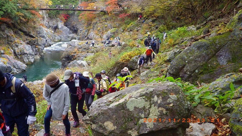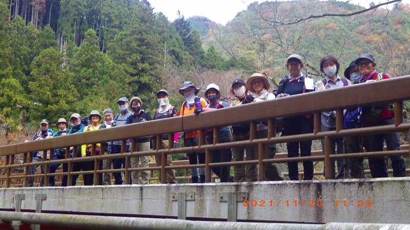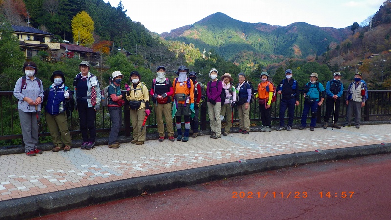 2021年11月23日(祝) 天気:晴れ レベル:一般向き 担当L :矢澤省三 協力者 :清水十三男 参加者 :17名(女性12名・男性5名) コース :軍畑駅10:30→御嶽渓谷→御嶽駅=古里駅 →鳩ノ巣渓谷→15:10奥多摩駅 歩程 :4時間30分 軍畑駅出発式 御岳渓谷歩道入口