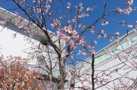 駅から少し歩いて目黒川近くでリーダーの説明 十月桜(八重咲)