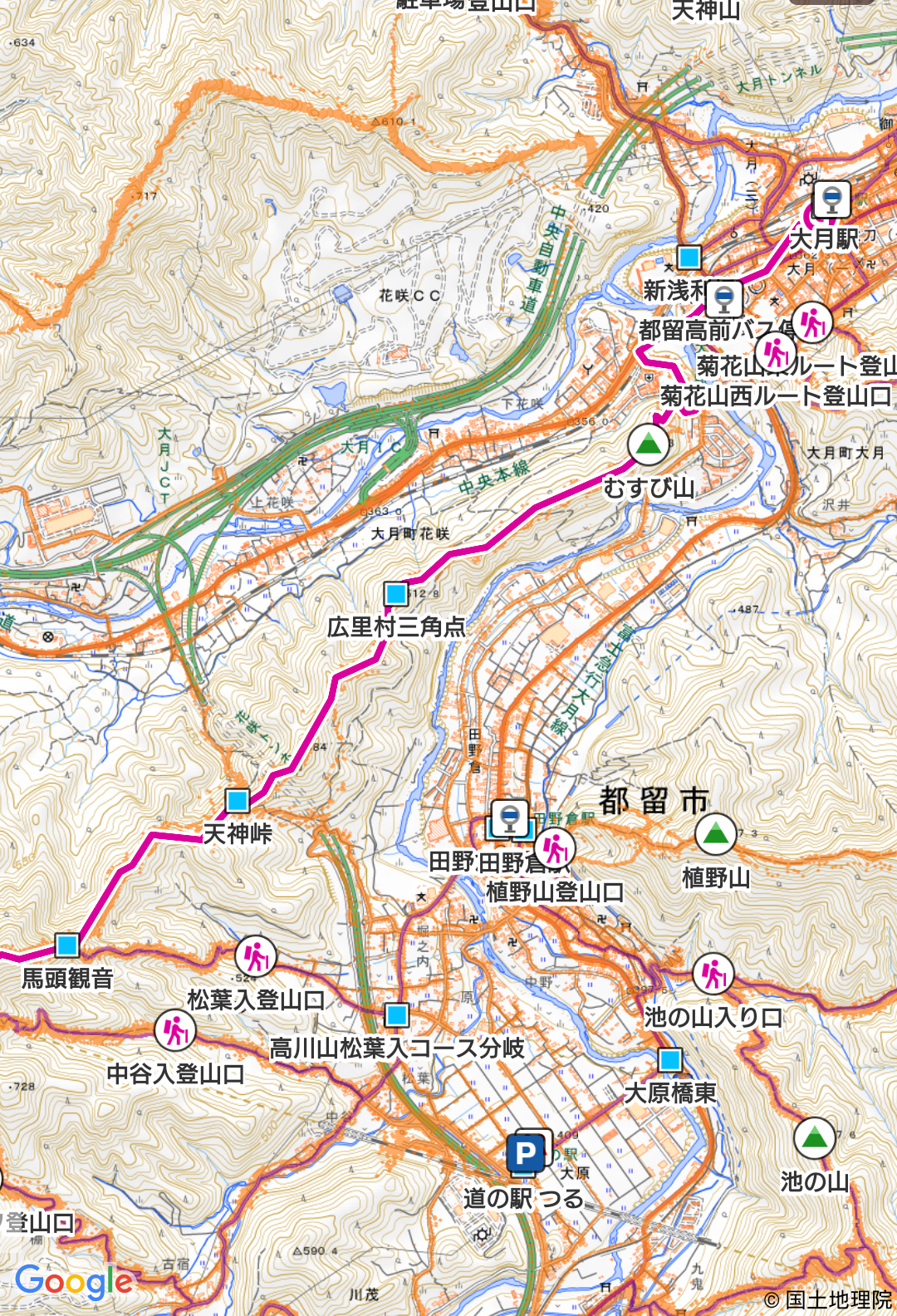 天神峠13:56ー14:56むすび山15:02ーむすび山登山口15:03-15:22大月駅
