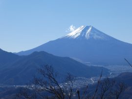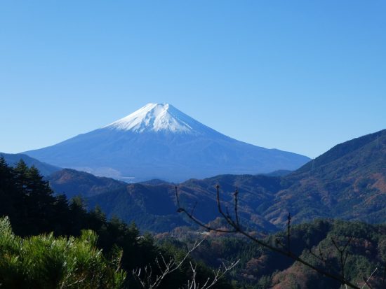 「富嶽秀麗十二景第11番。立派な富士山あり‼ この時期なら富士山のはずれはないと見込んでの山行を組んだが、日の短いのが心配。時間を見てコースの変更もありと説明してスタートしたが、みんな揃っての無心の歩きでまず高川山、下山も無心にむすび山に歩き繋いで、結果、予定より早めの大月駅到着となった。