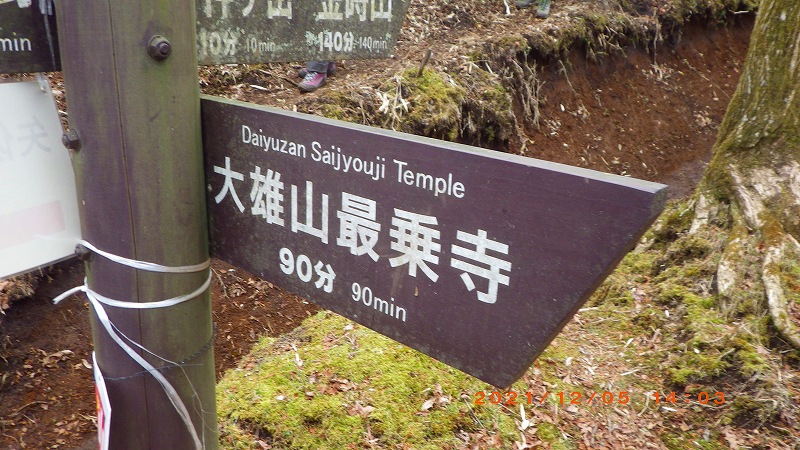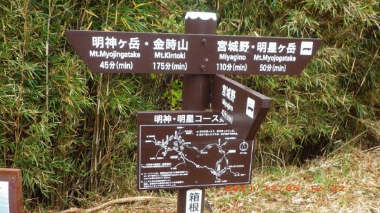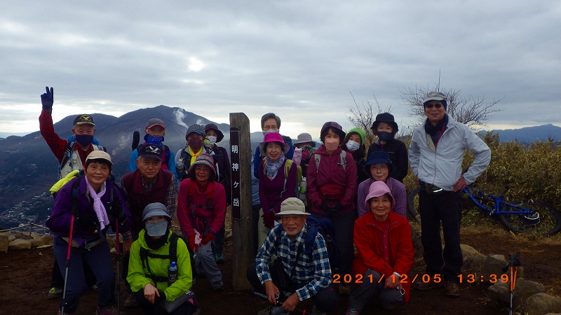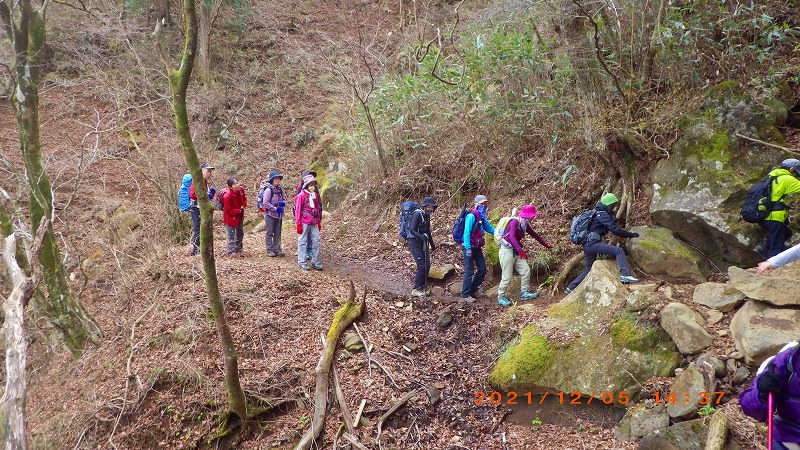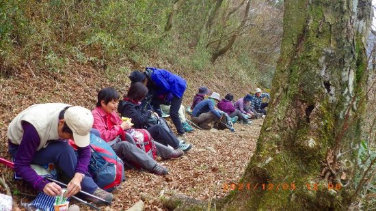 2021年12月5日(日) 天候:曇り レベル:一般強 担当L :矢澤省三 協力者 :清水十三男 現地協力者 :池田正義 参加者 :19名(女性:15名・男性4名) コース :宮城野バス停10:30→12:10鞍部(昼食)12:30→ 明神ケ岳13:40→15:35神明水→見晴小屋16:00→ 最乗寺17:00→18:10大雄山駅 行動時間:7時間30分 登山口 早速昼食タイム