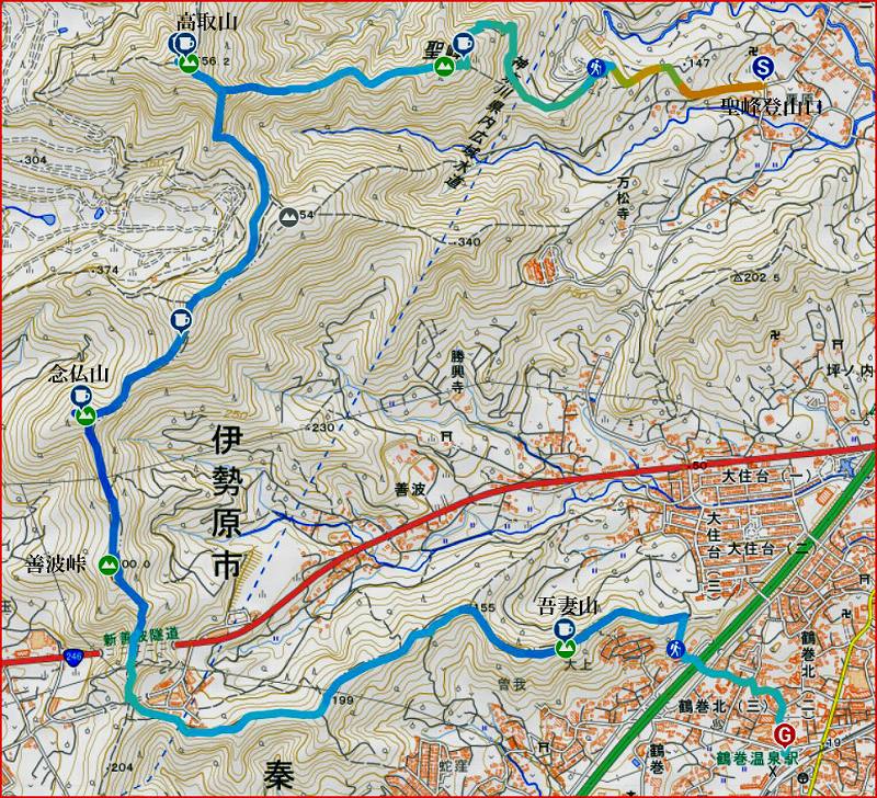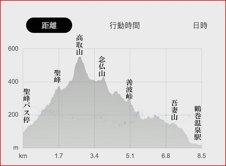 11:33→11:40高取山(昼食)12:12→13:20念仏山13:35→善波峠14:00→