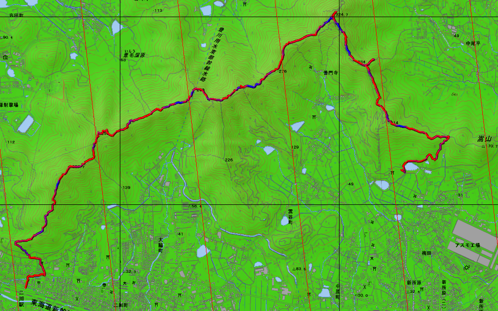 一日目の軌跡図。左下の二川駅~親水公園。距離:8.5Km。