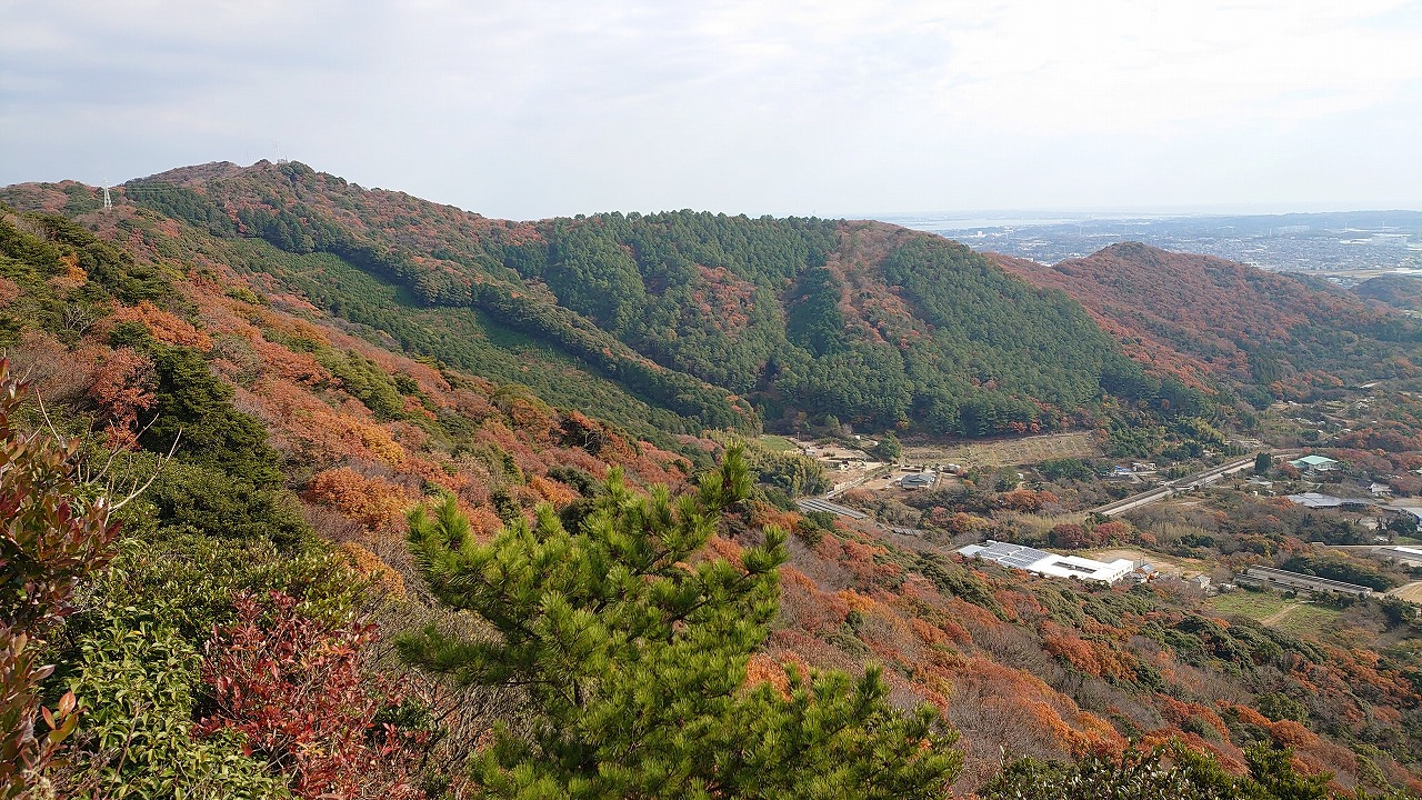 これから行くと思われる尾根(左側)。右の遠方は遠州灘。