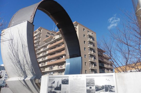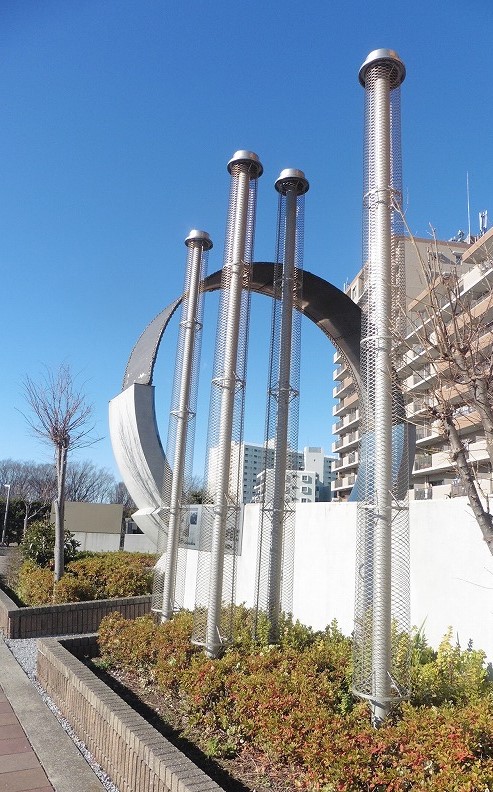 お化けエントツ 「帝京科学大学」構内に煙突外壁に使われた鉄の覆いがモニュメントとして残る。
