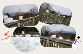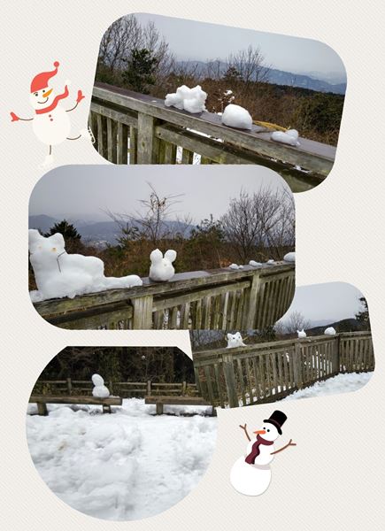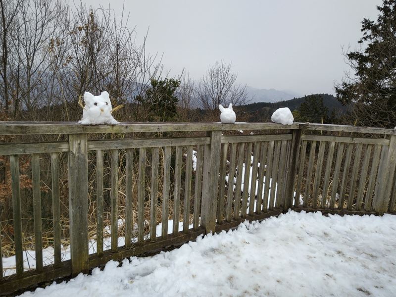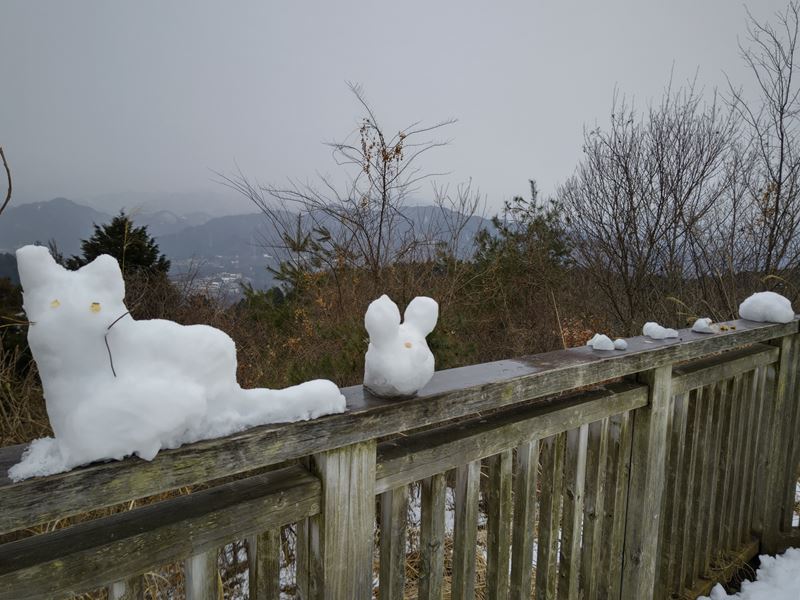 一丁平展望台にて集合写真📷、後ろで可愛い雪ウサギや雪ネコ達が見てました