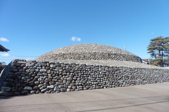 古墳は、三段構造で各段とも盛り土で築かれています。上から見た形は1段目と2段目が正方形で3段目が円形です。2段目と3段目は全面が河原石で覆われています。側面を「葺石」、上面を「貼石」と呼びます。1段目は外周には直方体に面取りされた切り石による「縁石」が並べられています。