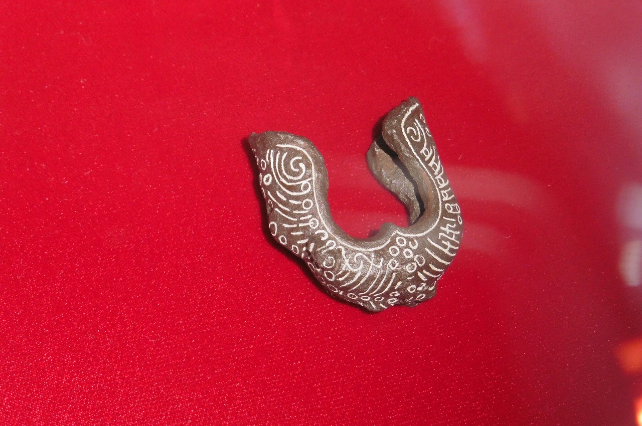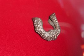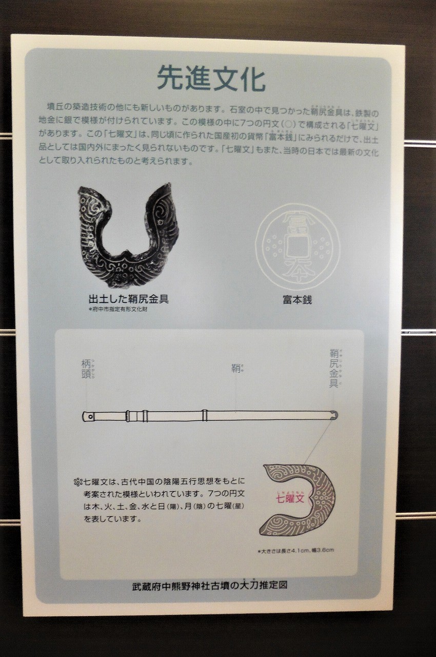 石室内に、埋葬時の副葬品は、ほとんど残っていませんでした。しかし、ガラス玉・鞘尻金具・環金具・釘が残されていました。この中で特に注目されるのは、太刀の一部である、鞘尻金具に刻まれた「七曜文」という文様です。