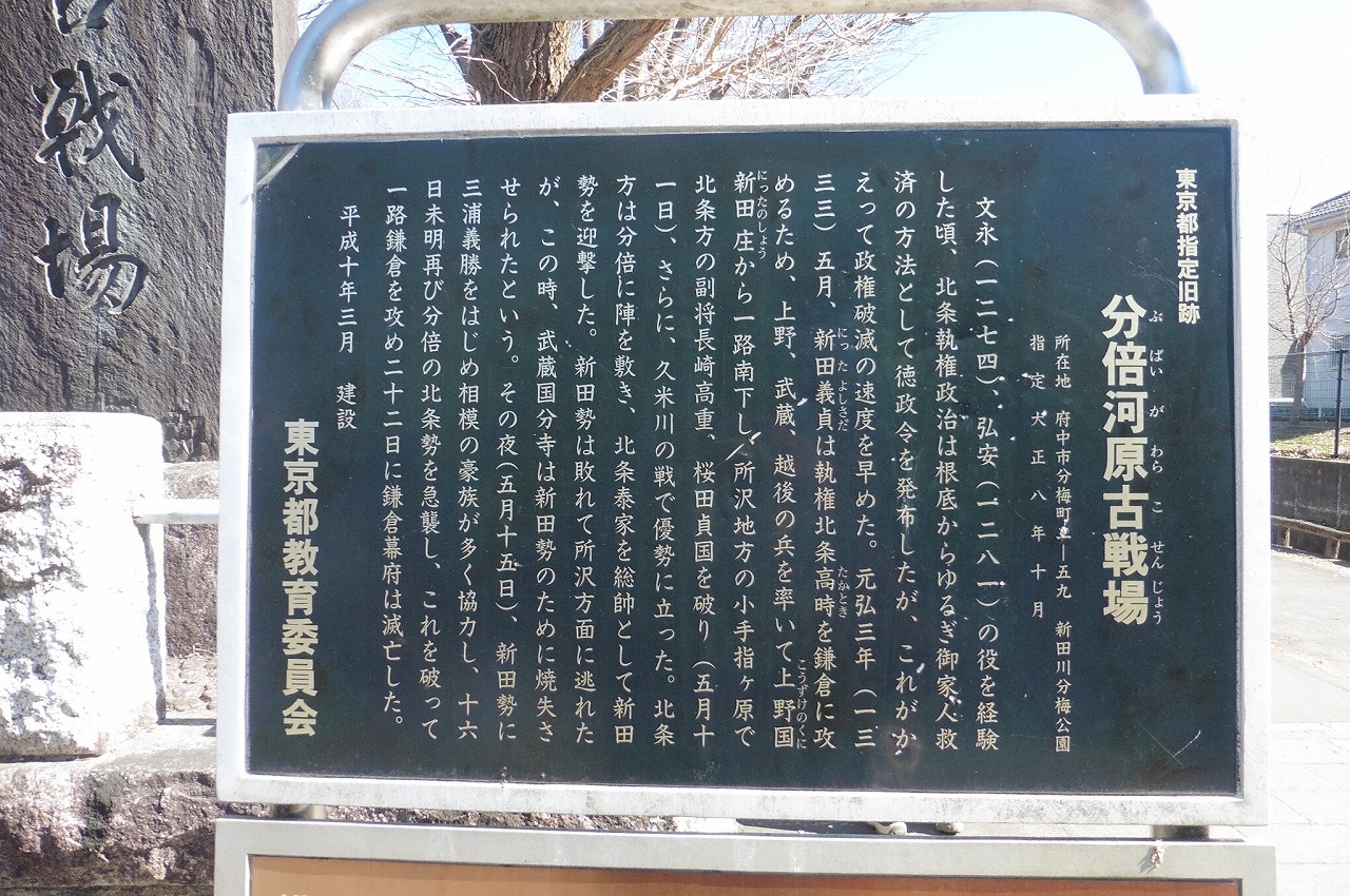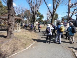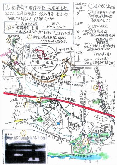 JR南武線西府駅(10:30)→武蔵府中熊野神社古墳展示館(10:56)→御嶽塚古墳(11:38)→新田川緑道→古戦場碑→新田川分梅公園(12:10~13:00)昼食→郷土の森公園・梅園見学(13:30~14:20)解散→JR武蔵野線 府中本町駅&バスで京王線 分倍河原駅へ