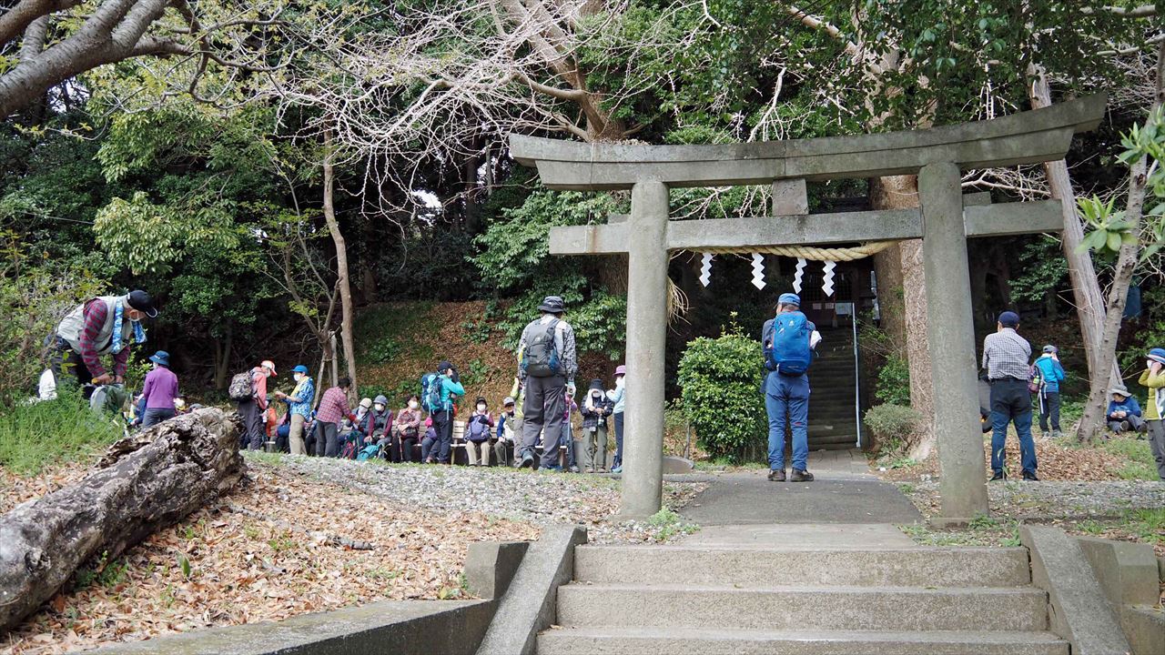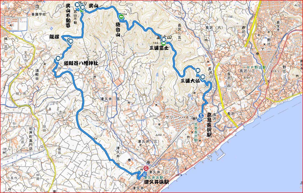 京急長沢駅10:00→三浦大仏10:25→三浦富士11:20→砲台山11:50→12:10武山(昼食)12:50→武山不動尊院13:05→龍塚13:25→須軽谷八幡神社14:00→14:45津久井浜駅