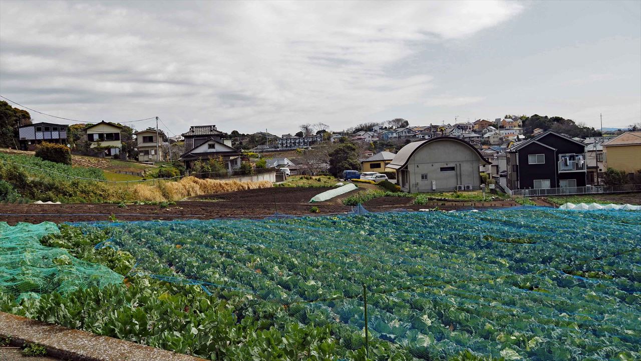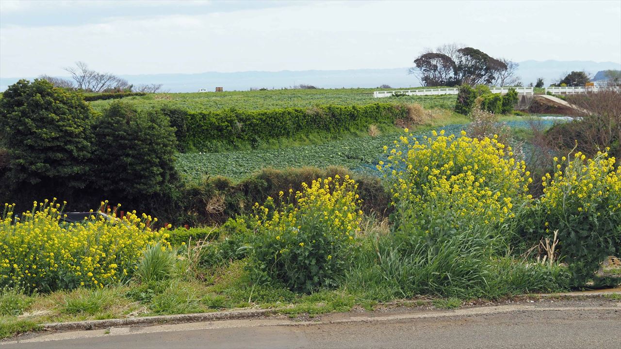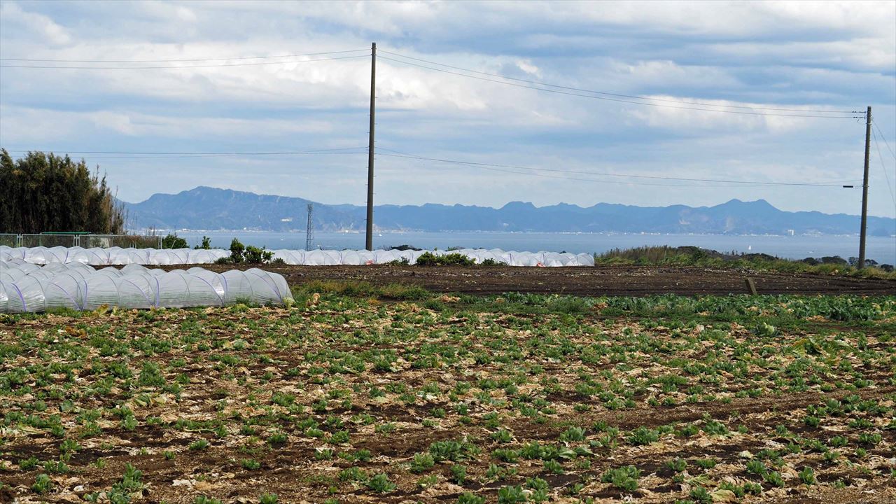 至る所にビニールハウス。何を栽培しているのか?遠くに房総の山並みが見える。