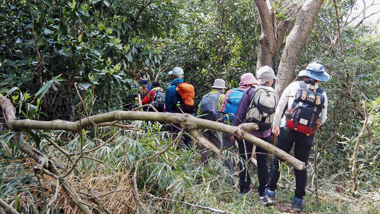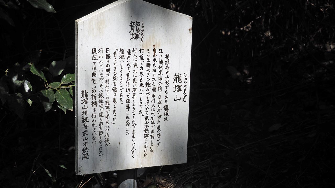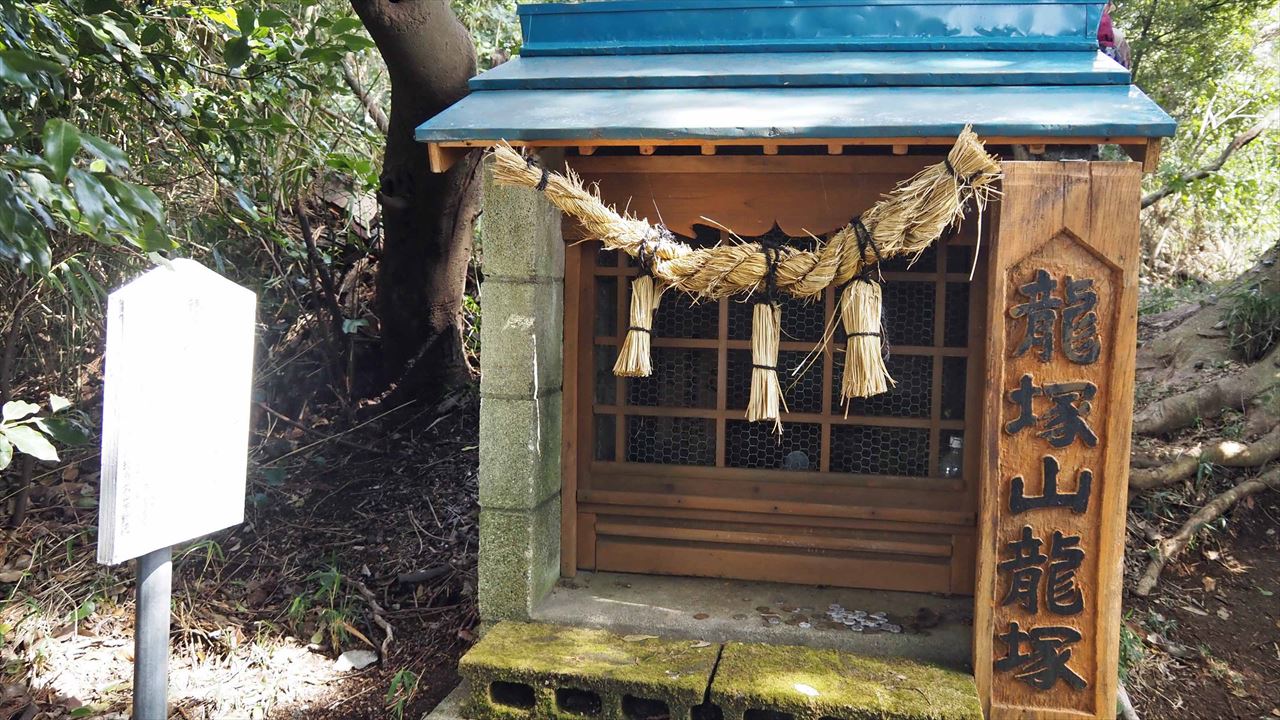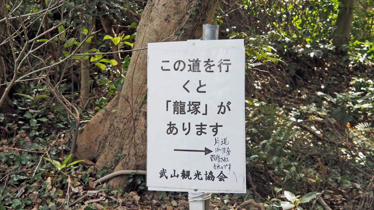 今回は、常緑樹マテバシイが茂る、三浦半島の3つの低山を繋ぐ「武山ハイキングコース」を歩きました。龍塚の周辺のヤブは、以前と違い綺麗に刈り取られ通り抜けができるように整備されていました。