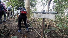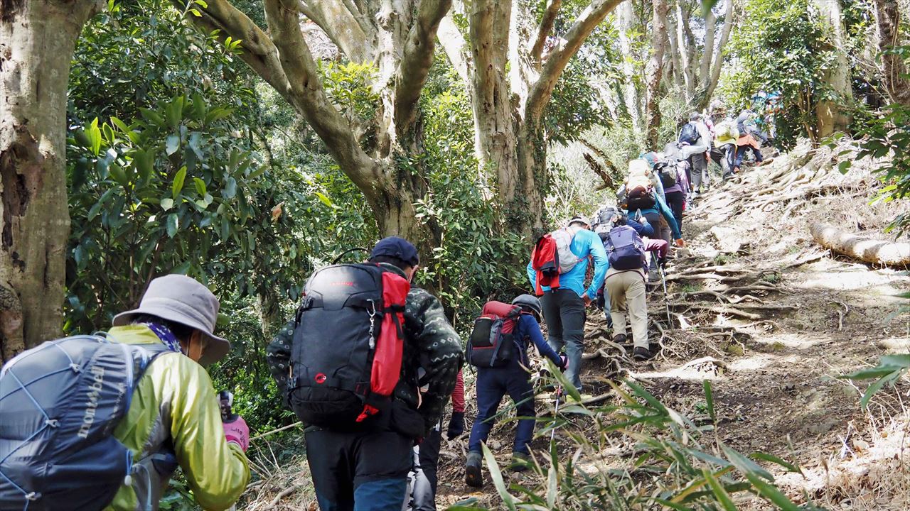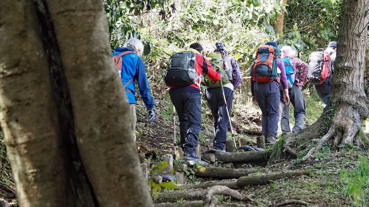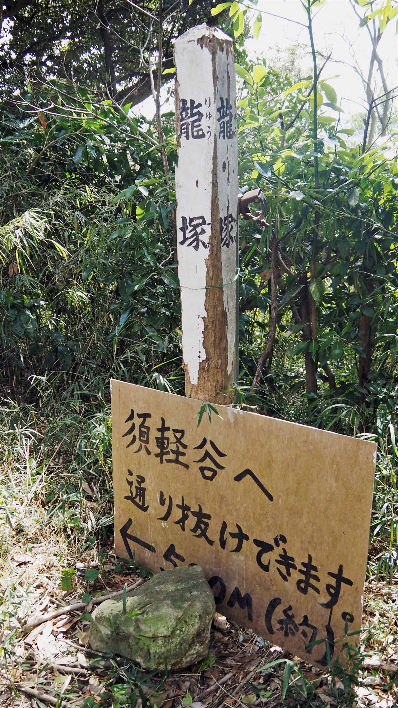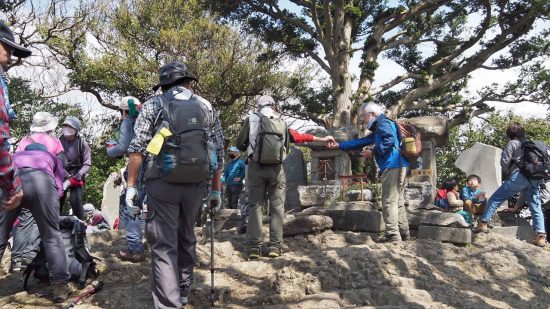 今回は、常緑樹マテバシイが茂る、三浦半島の3つの低山を繋ぐ「武山ハイキングコース」を歩きました。龍塚の周辺のヤブは、以前と違い綺麗に刈り取られ通り抜けができるように整備されていました。