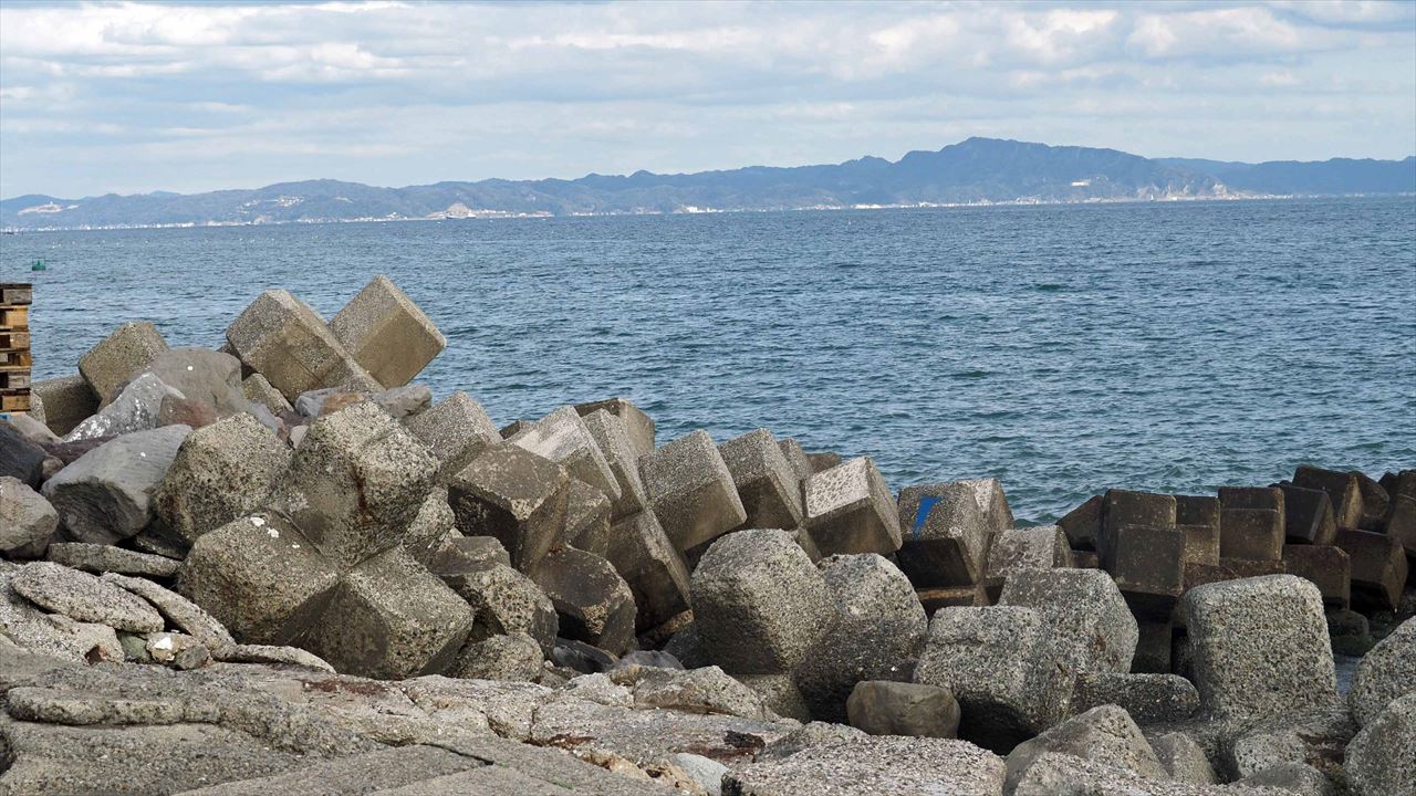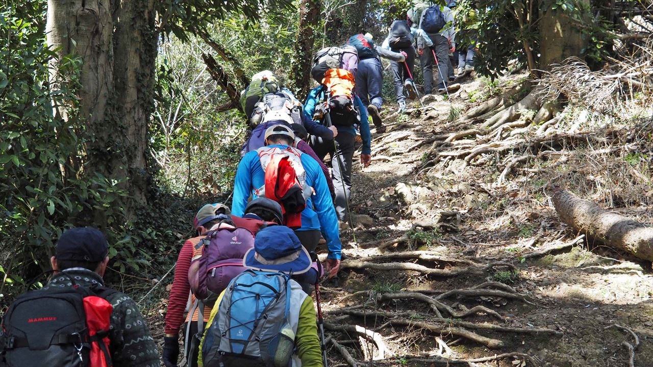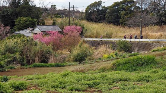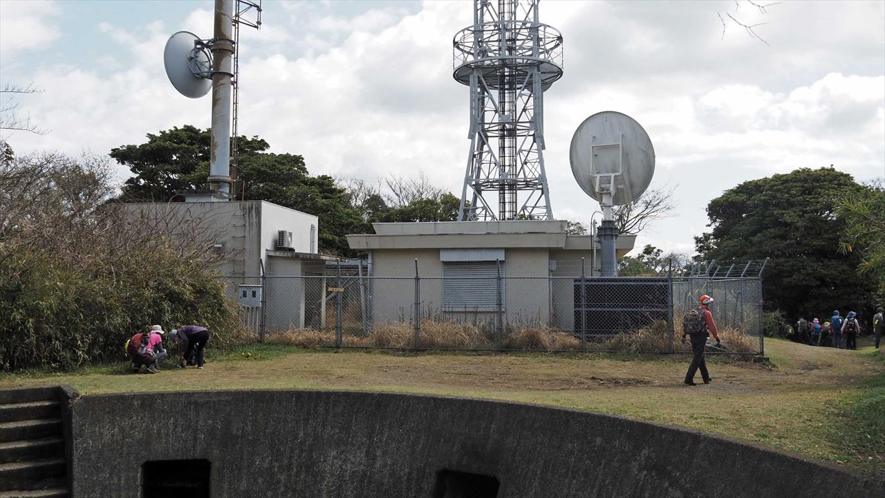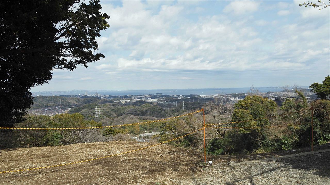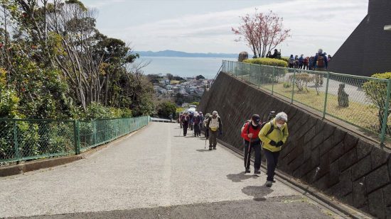 後方は房州の山々です。急なスロープを登る。先頭は高台にいます。