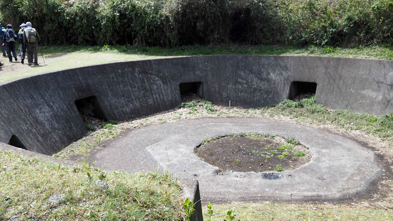 すり鉢状の砲台跡が残る。戦時中には海軍の高角砲が据え付けられていました。8個の四角い穴は、弾薬の格納庫で終戦間際には12.7cm高角砲2基、13.0mm連装機銃などが装備されていました。