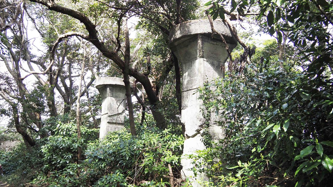 海上保安庁武山受信所のアンテナと旧海軍計算所跡の柱。登山路の右側にありました。