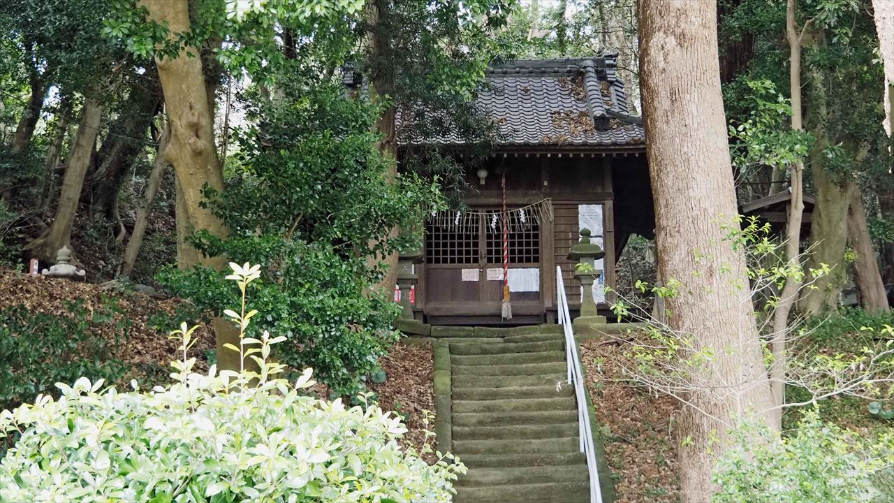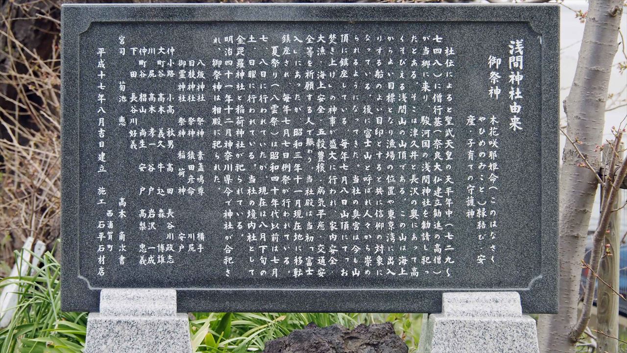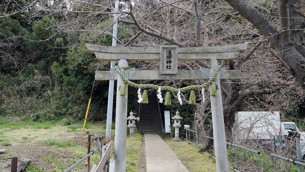浅間神社は津久井浜駅近くにあります。漁師たちは三浦富士や武山を目印に漁場の位置を確認したといわれた。